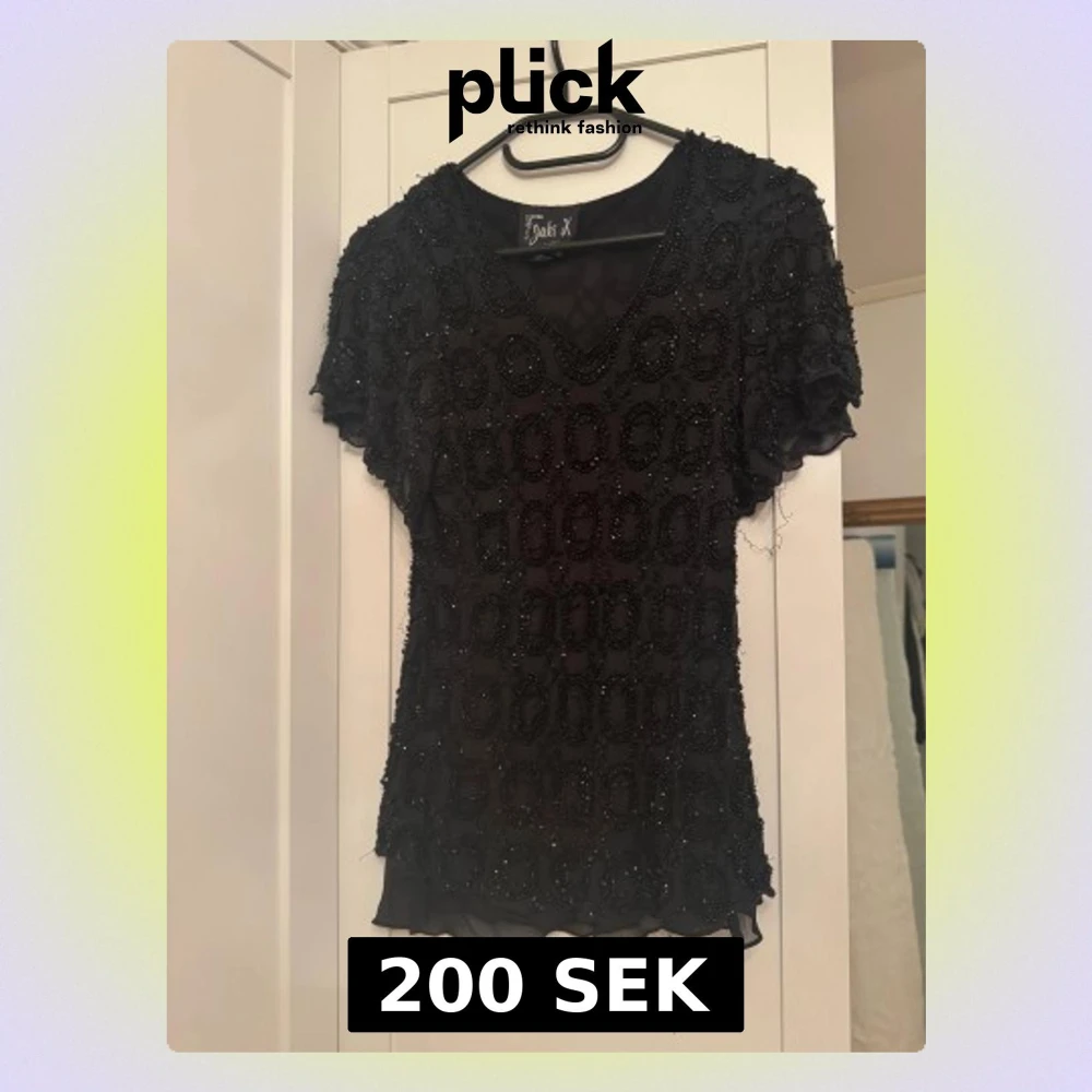 Svart glittrig topp/blus som jag skulle säga är i stolen L typ. Lappen sitter löst på ena sidan men verkar inte vara något problem med själva plagget. Jättefin till fest🤗
