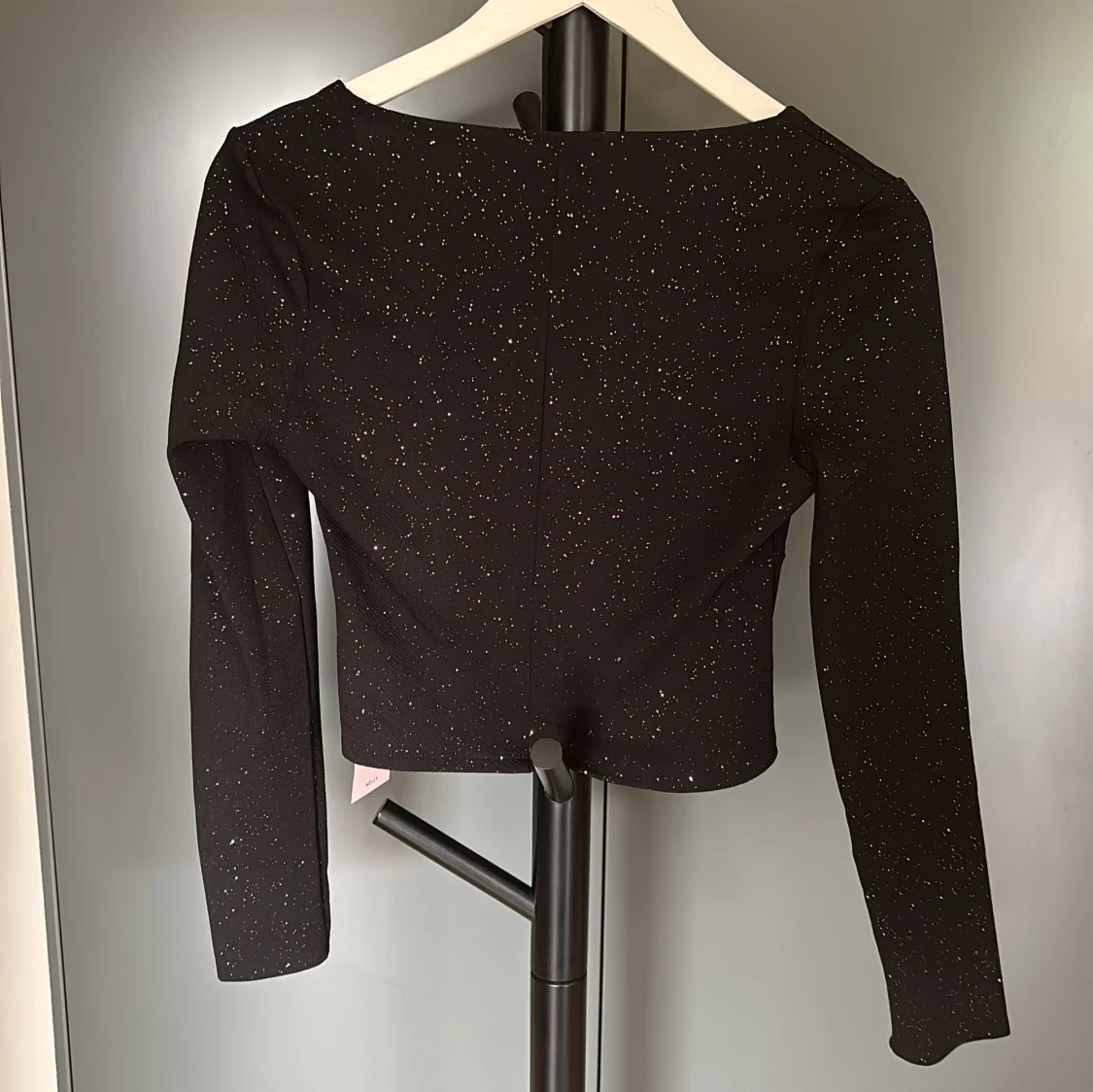 Supersnygg svart topp från Nelly med glittriga detaljer och lång ärm. Toppen har en croppad passform och markerad byst med fyrkantig urringning. Perfekt för dig som vill sticka ut med lite extra glitter.