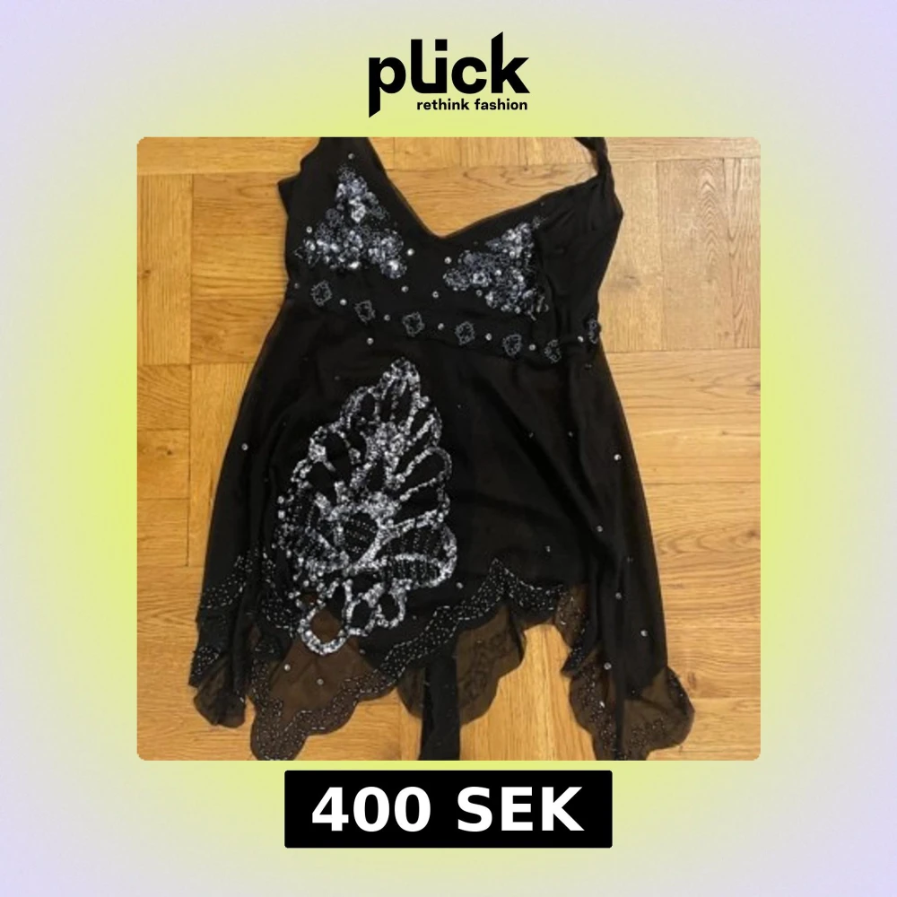 Supersnygg svart topp med tunna axelband och v-ringning. Toppen har glittriga paljettdetaljer och broderier framtill, samt vågig spetskant nertill. Materialet är lätt och transparent med dekorativa pärlor och knytband i ryggen. Perfekt för dig som vill sticka ut.