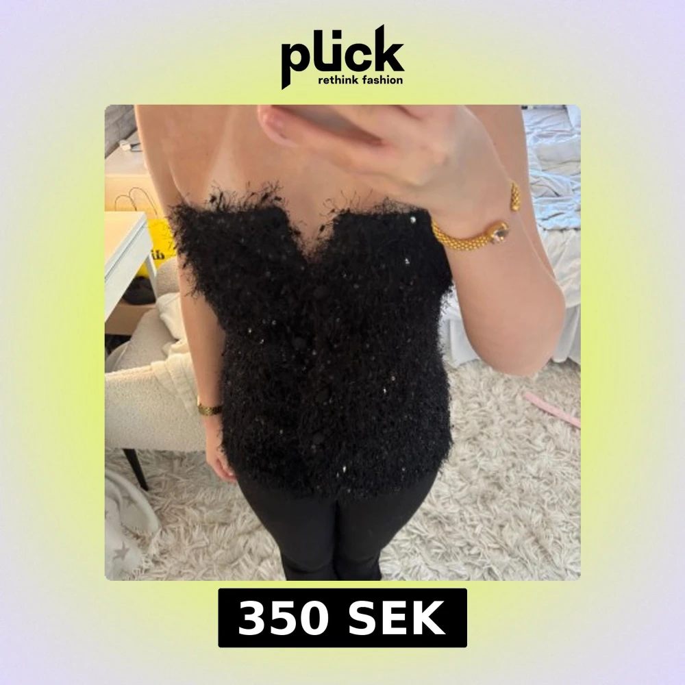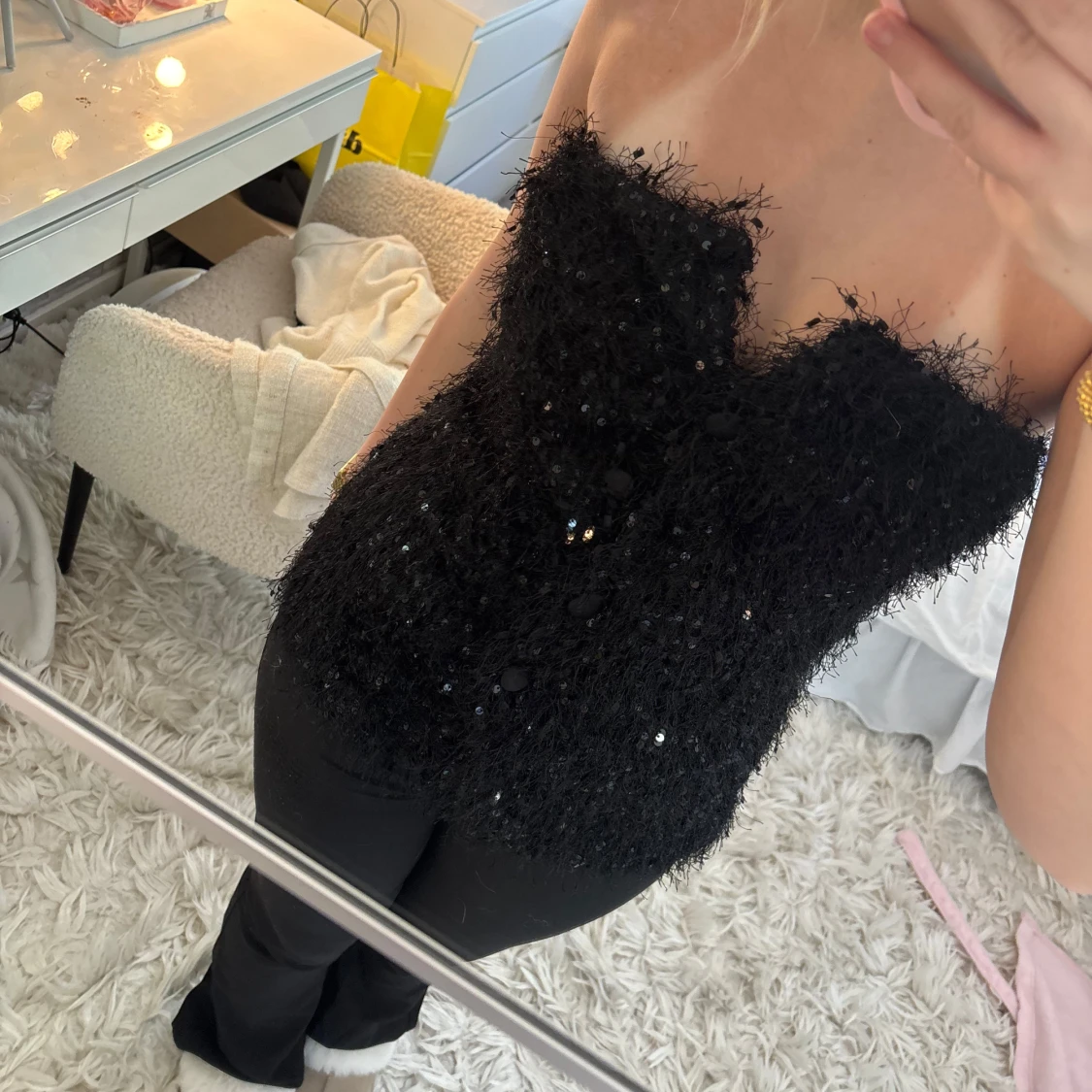 Säljer en svart tubtopp med glittriga paljetter och fluffig textur. Toppen är axelbandslös och är perfekt för festligare tillfällen! Säljer då den var för stor för mig💖