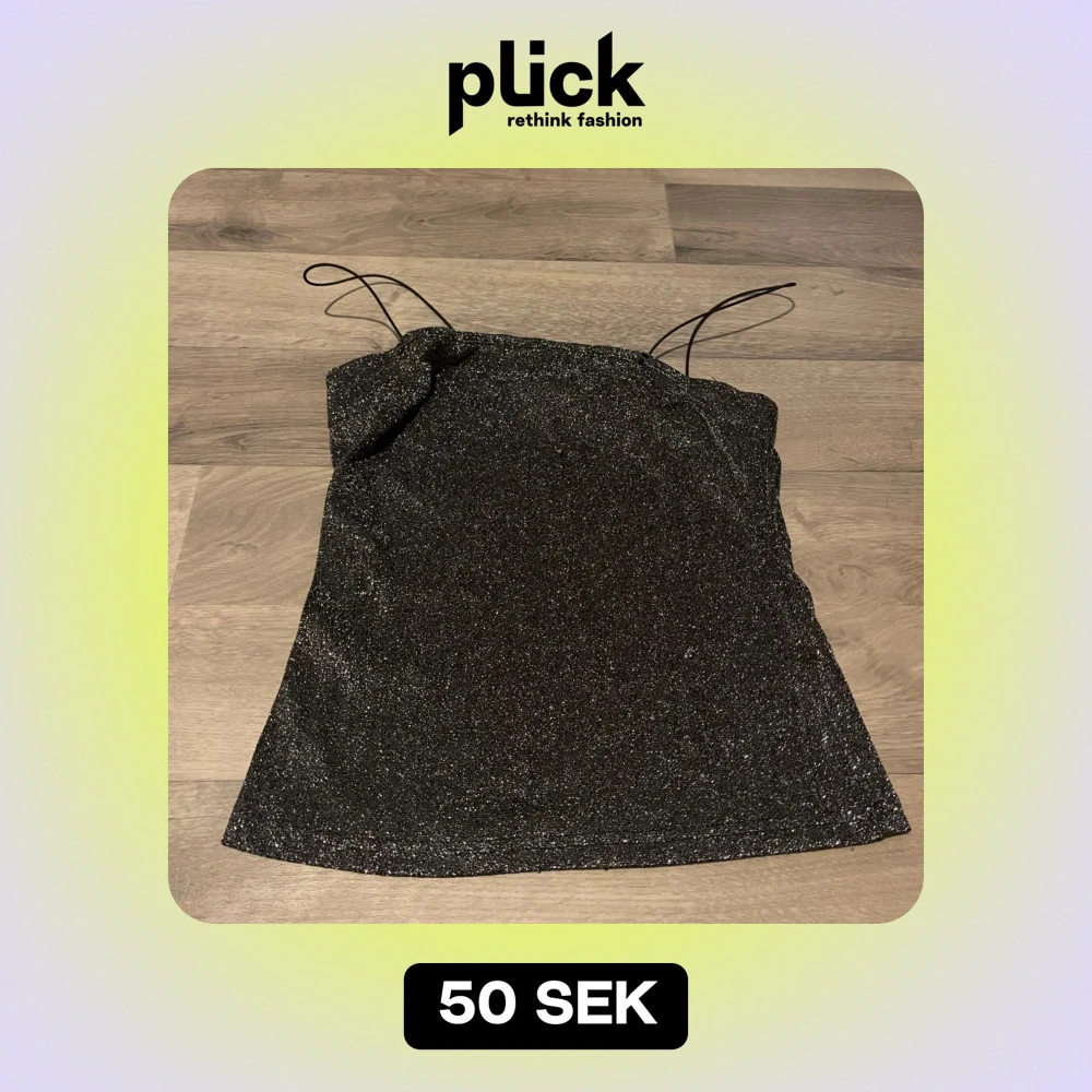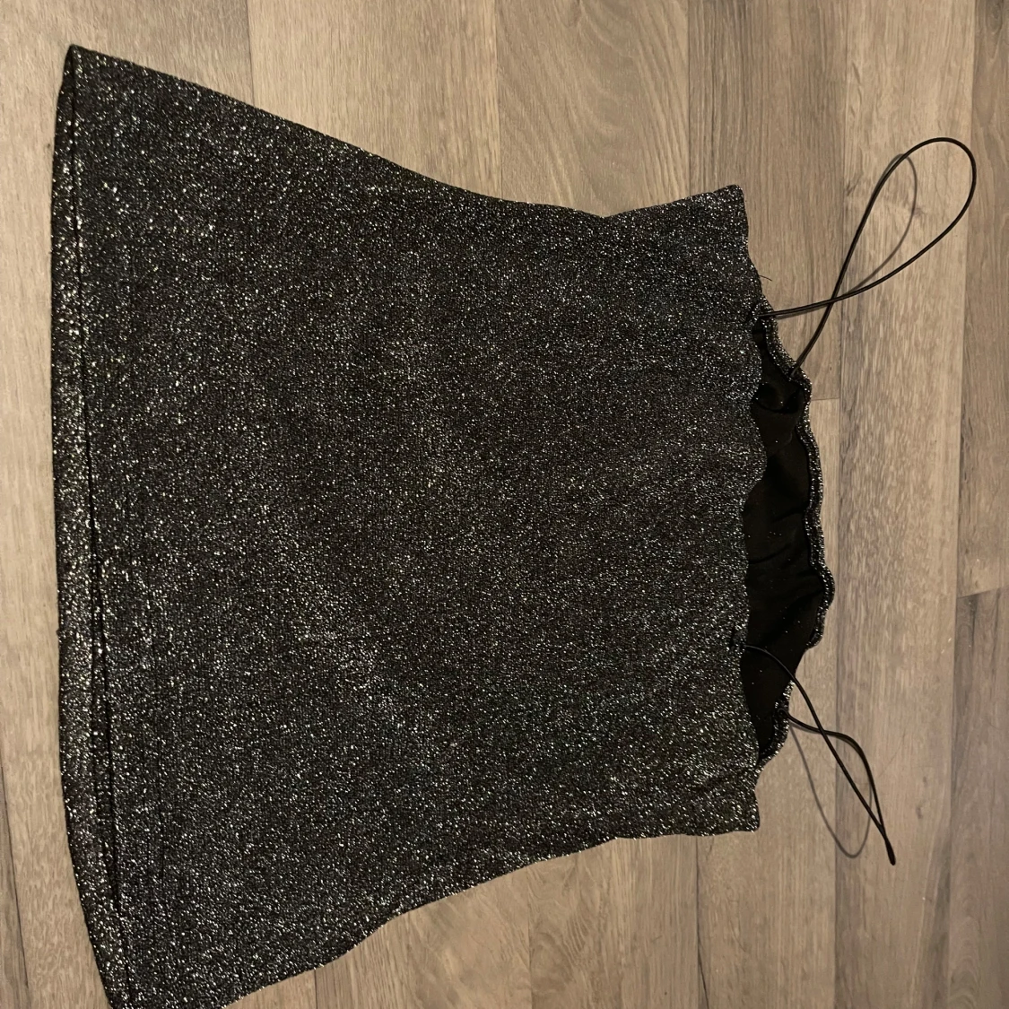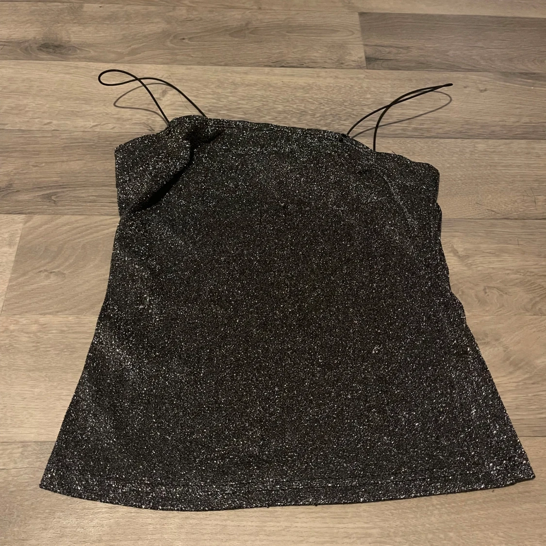 Säljer en snygg svart glittrig tubtopp med tunna axelband. Perfekt för festliga tillfällen! Toppen har en enkel och stilren design som gör den lätt att matcha med olika outfits. Den är i bra skick och redo för nästa ägare.