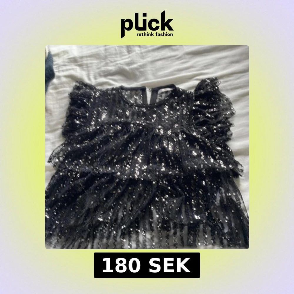 Supersnygg svart blus från Gina Tricot med massor av paljetter och volanger. Puffiga axlar och transparent mesh ger en extra cool look. Perfekt när du vill sticka ut och glänsa! Stängs med knapp i nacken.