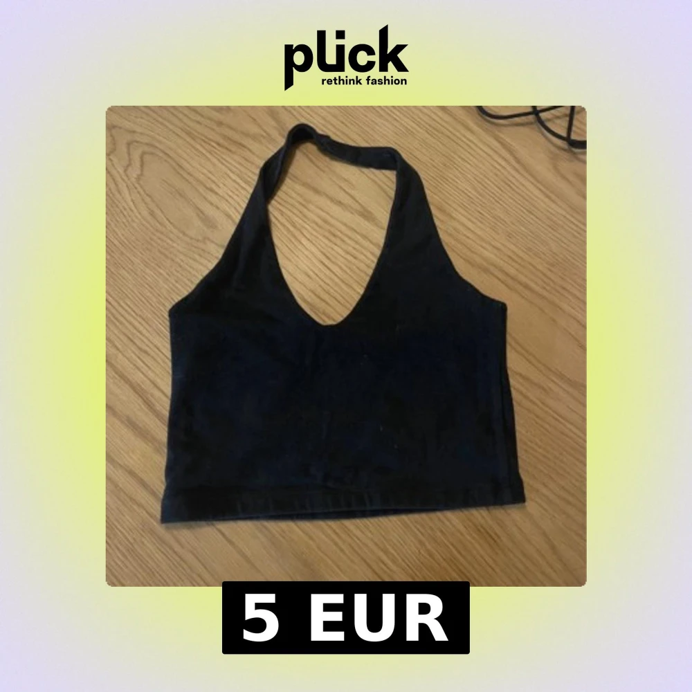 Svart croppad halterneck topp med djup v-ringning. Enkel och stilren design som passar perfekt till jeans eller kjol. Tunn och mjuk bomullskänsla, ärmlös och med breda band som knyts i nacken.