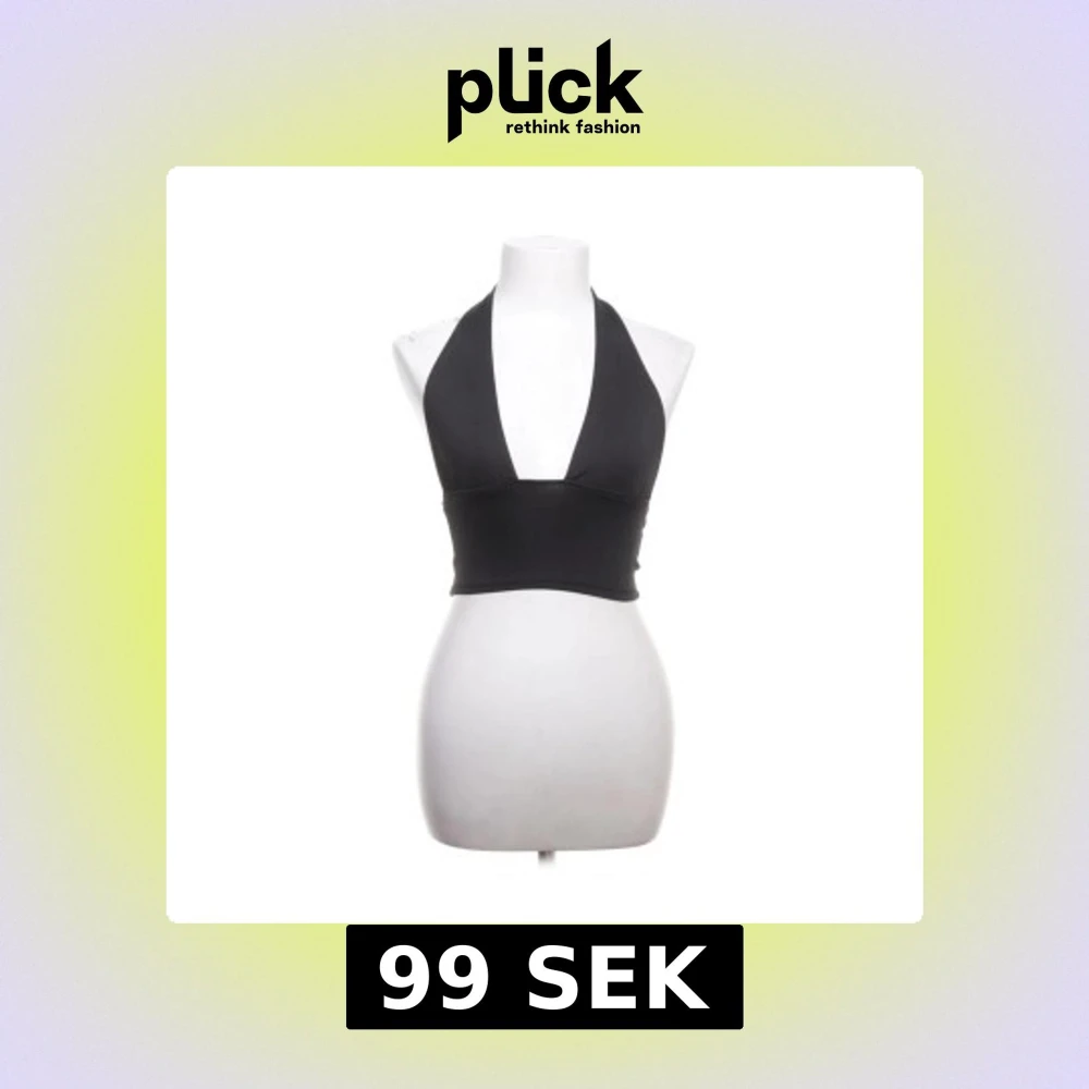 Svart croppad halterneck topp med djup v-ringning och bred resår under bysten. Snygg minimalistisk design som knyts i nacken och lämnar ryggen bar. Perfekt för att skapa en cool och trendig look.