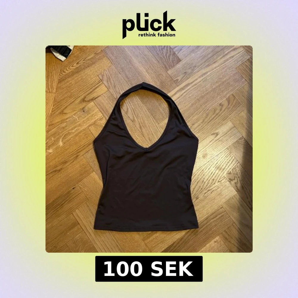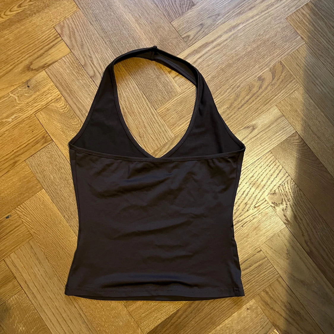 Säljer en svart halterneck linnetopp med djup v-ringning och smal passform. Toppen är ärmlös och har en stilren, enkel design som är lätt att matcha. Materialet känns mjukt och stretchigt, perfekt för dig som gillar minimalistiska och trendiga plagg.