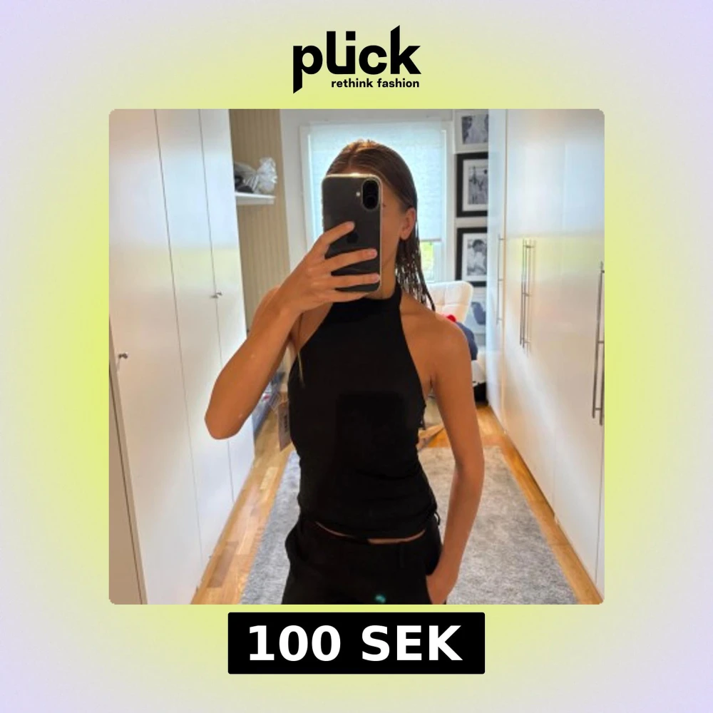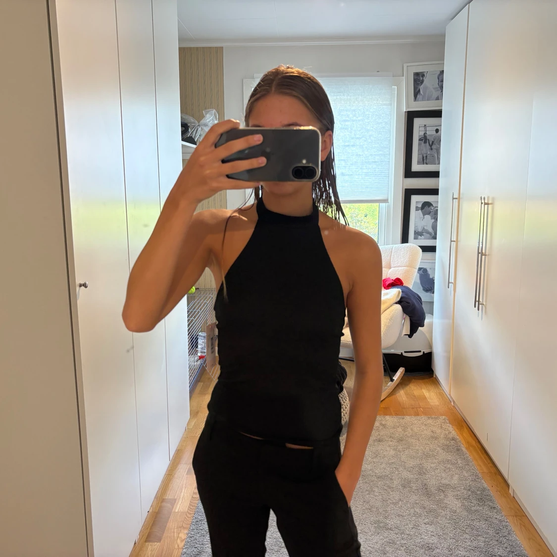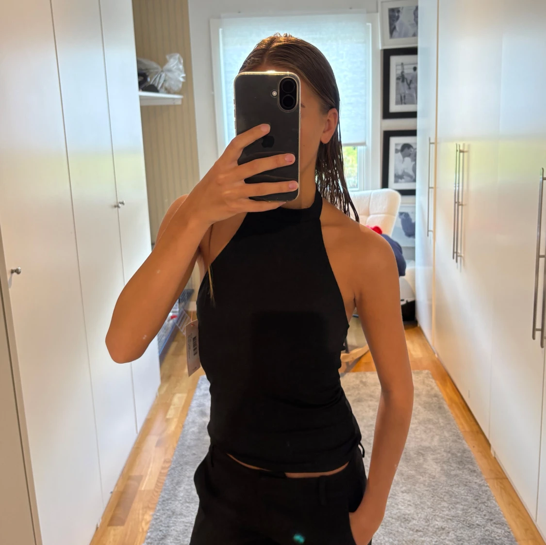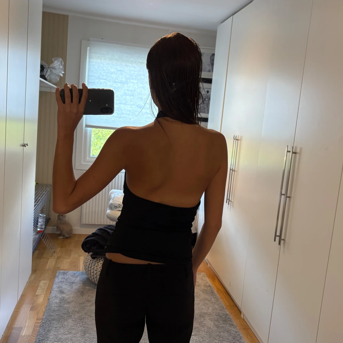 Säljer en svart halterneck linnetopp med hög hals och öppen rygg.