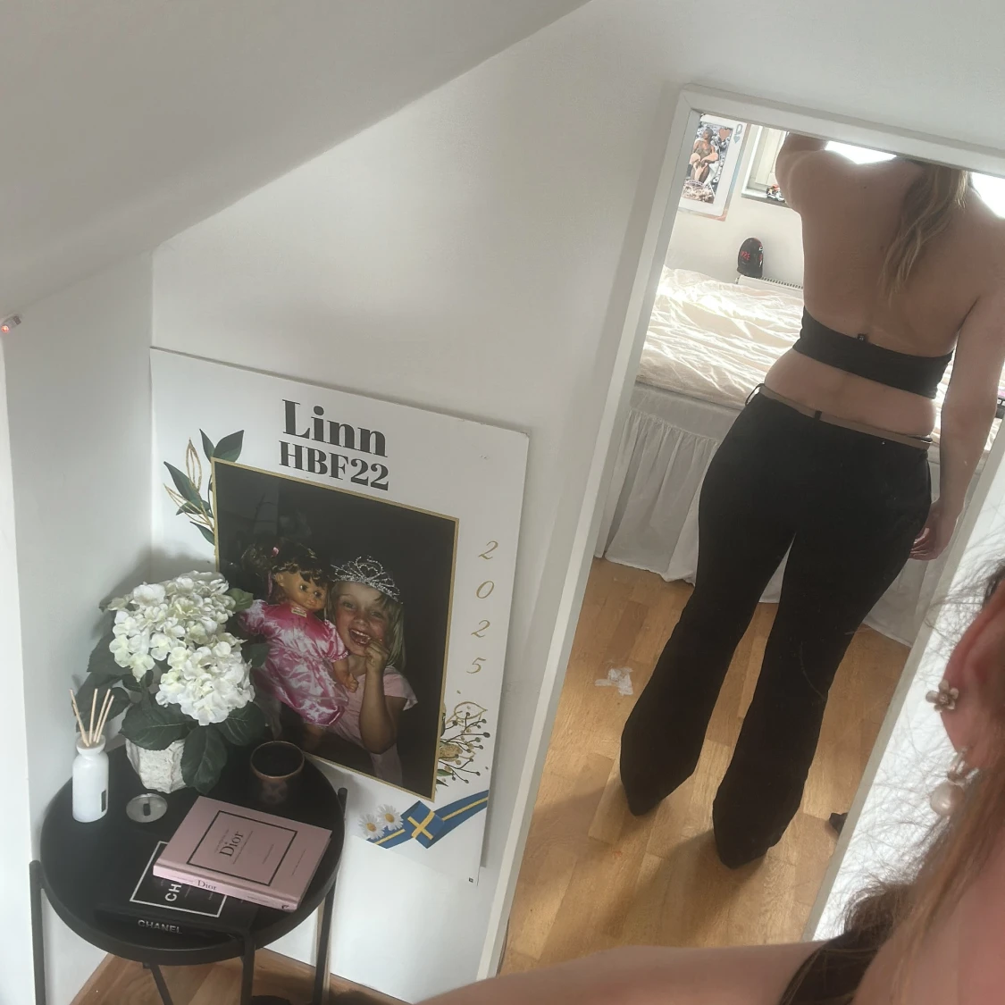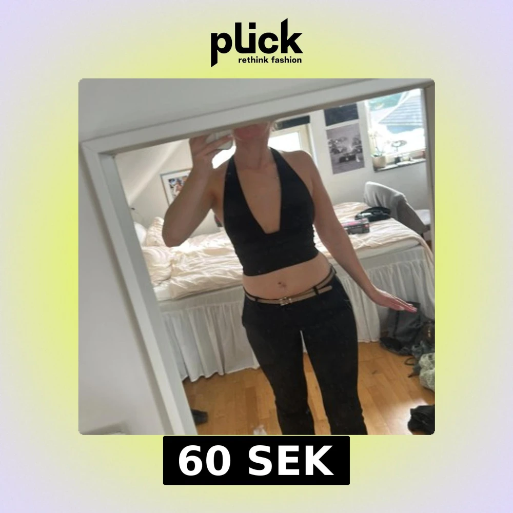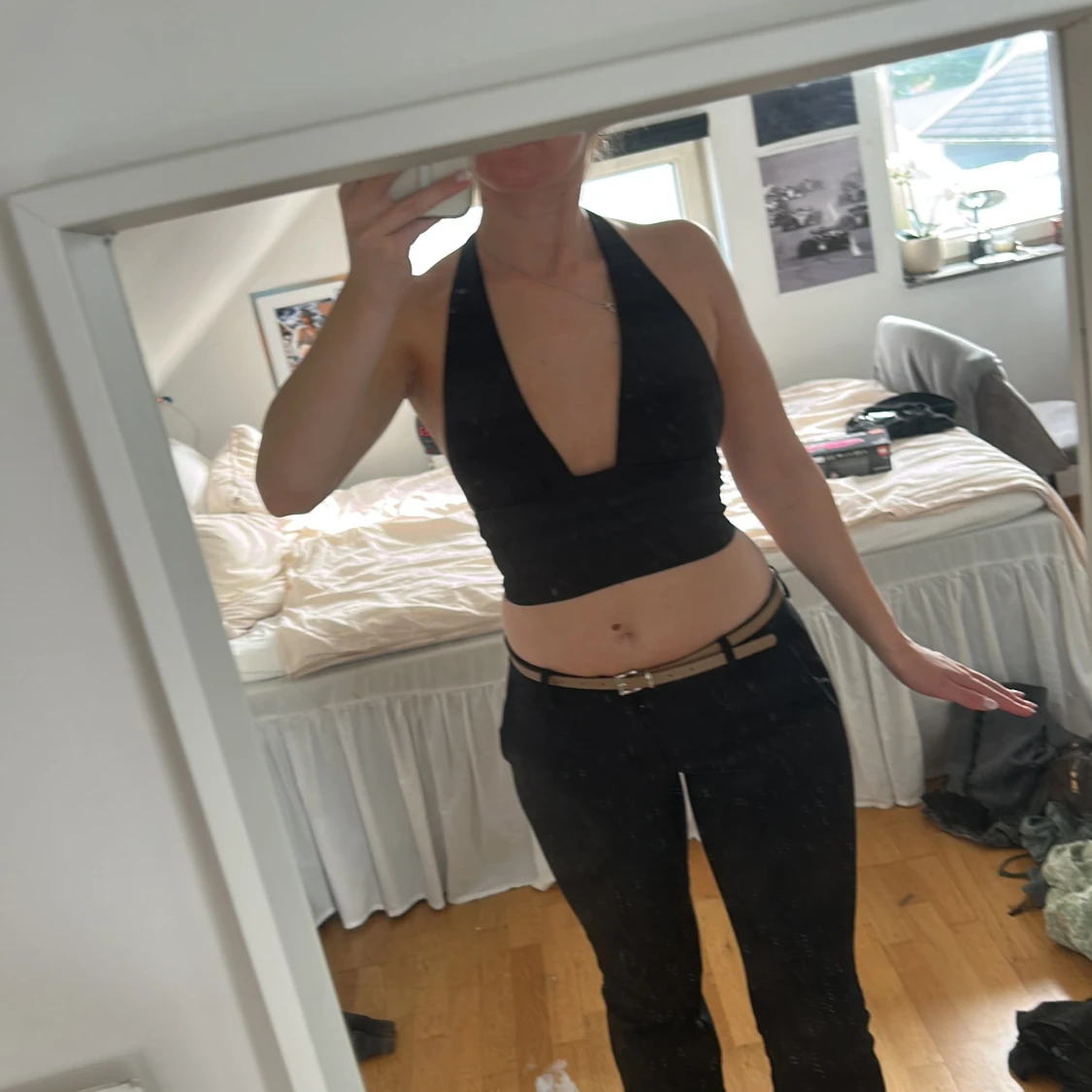 Snygg svart halterneck topp med djup urringning. Perfekt för en kväll ute eller en somrig dag. Toppen är ärmlös och har en tight passform som framhäver figuren.