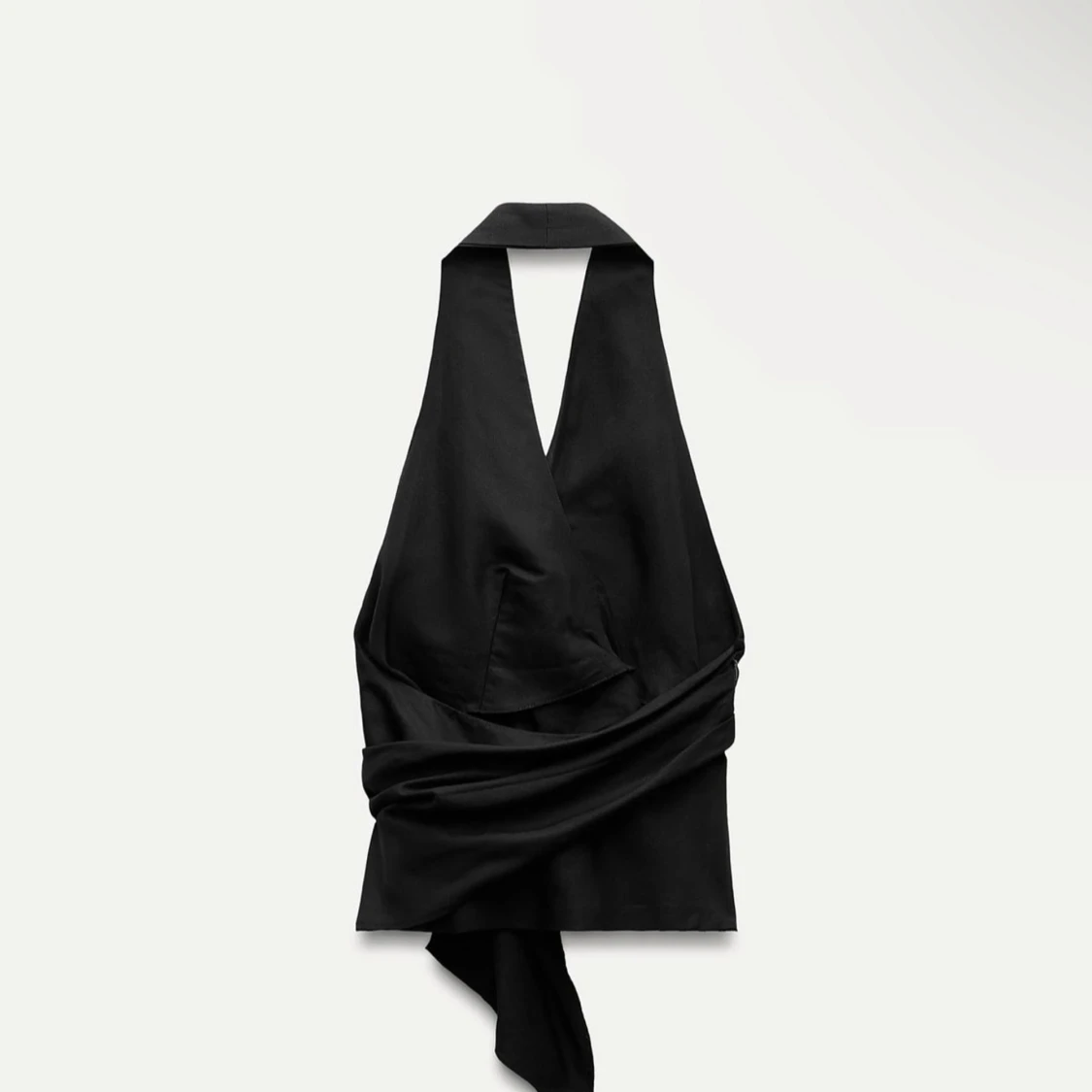 Elegant svart halterneck topp med knytning framtill. Perfekt för en stilren look. Helt ny, aldrig använd, lappen finns även kvar. (Omlotopp) tröjan kommer tas bort inom en vecka från min Plick