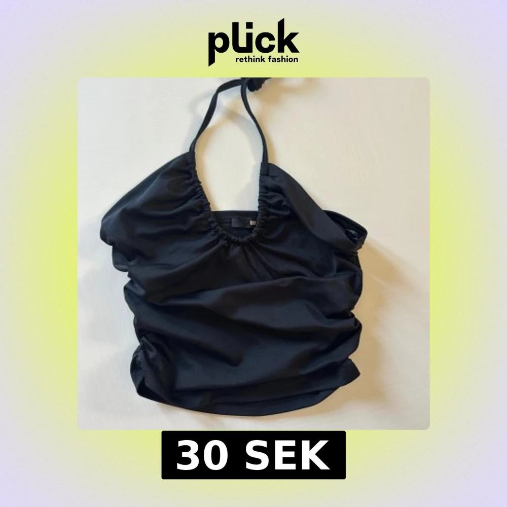 Svart halterneck topp från BikBok i slät polyester. Toppen har rynkade detaljer längs halsringningen och knytband i nacken. Perfekt för dig som gillar en enkel men snygg look med lite edge.