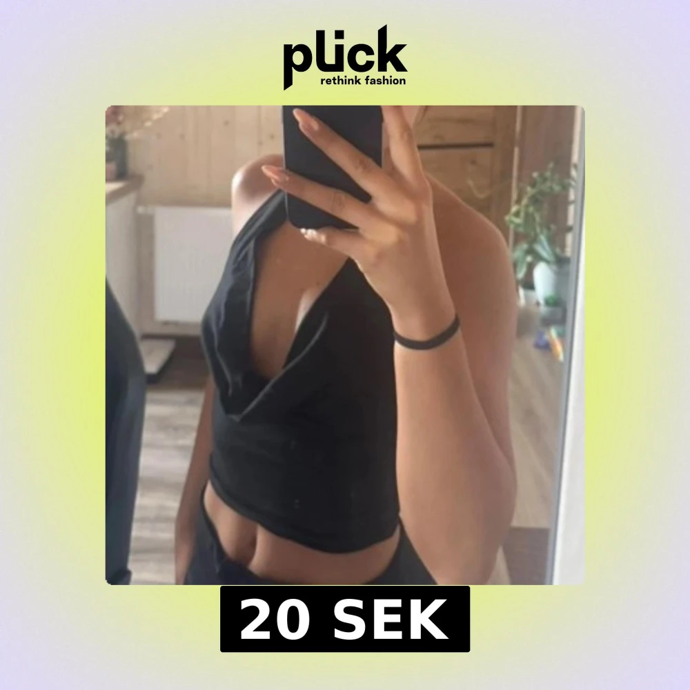 Säljer en svart halterneck tubtopp med breda band som knäpps i nacken. Toppen har en enkel och stilren design, perfekt att matcha med jeans eller kjol. Mjuk och stretchig bomullskänsla för en bekväm passform. Öppen rygg. Lånad bild