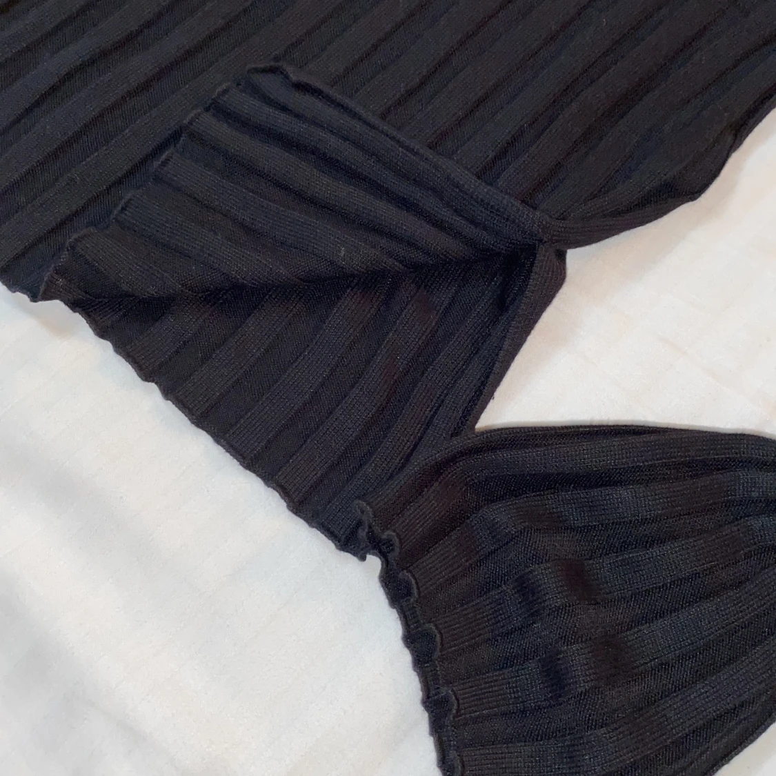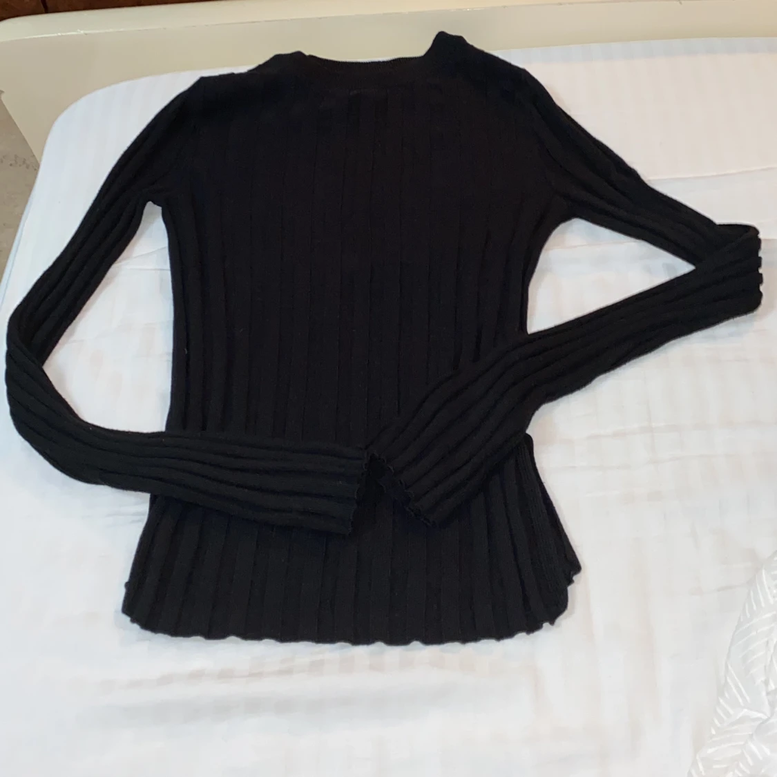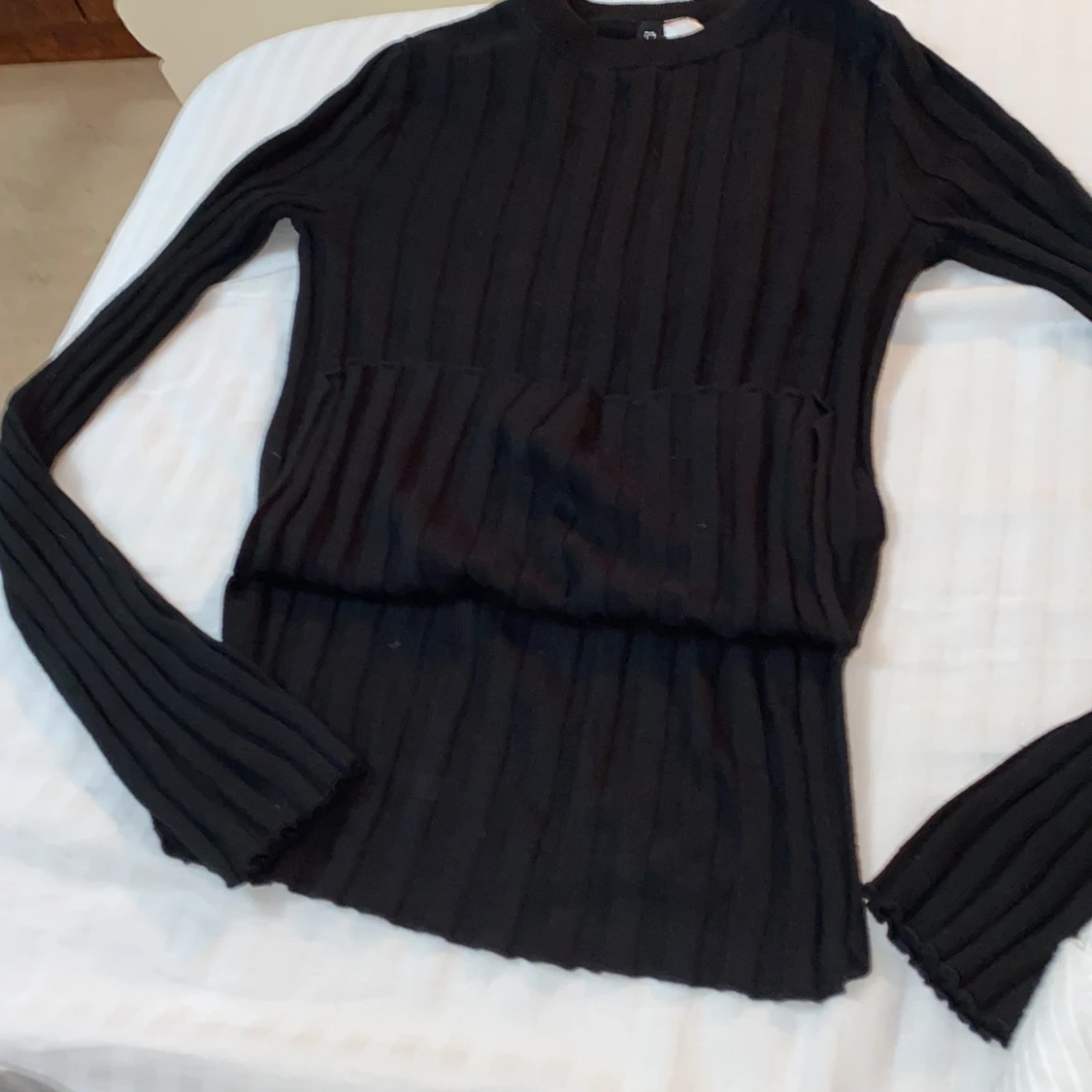 En jättefin svart tröja som är ribbad. Har snittar vid sidorna (se bild). Har lite utsvängda armar. Är i storlek XS. Köparen står för frakten ❤️