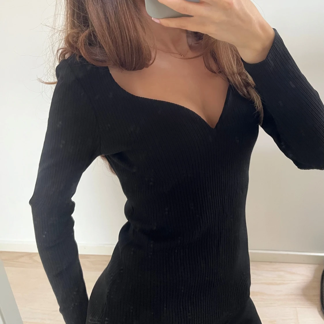 Säljer en svart, ribbad tröja med lång ärm och djup v-ringning. Tröjan har en tight passform och är perfekt för dig som gillar en stilren och enkel look.