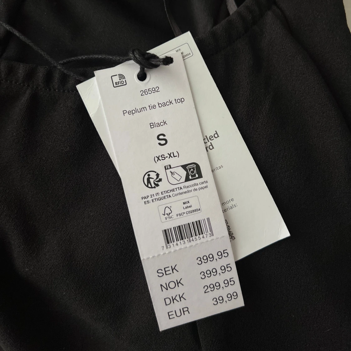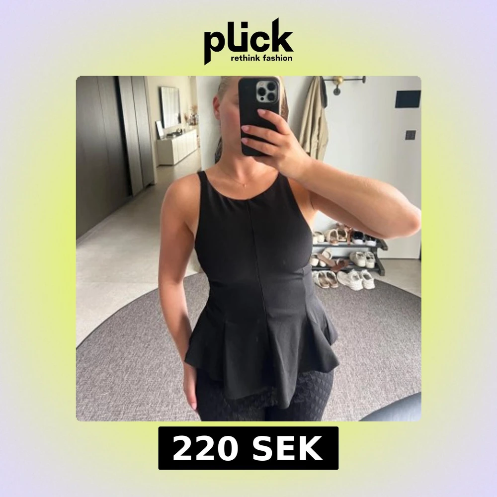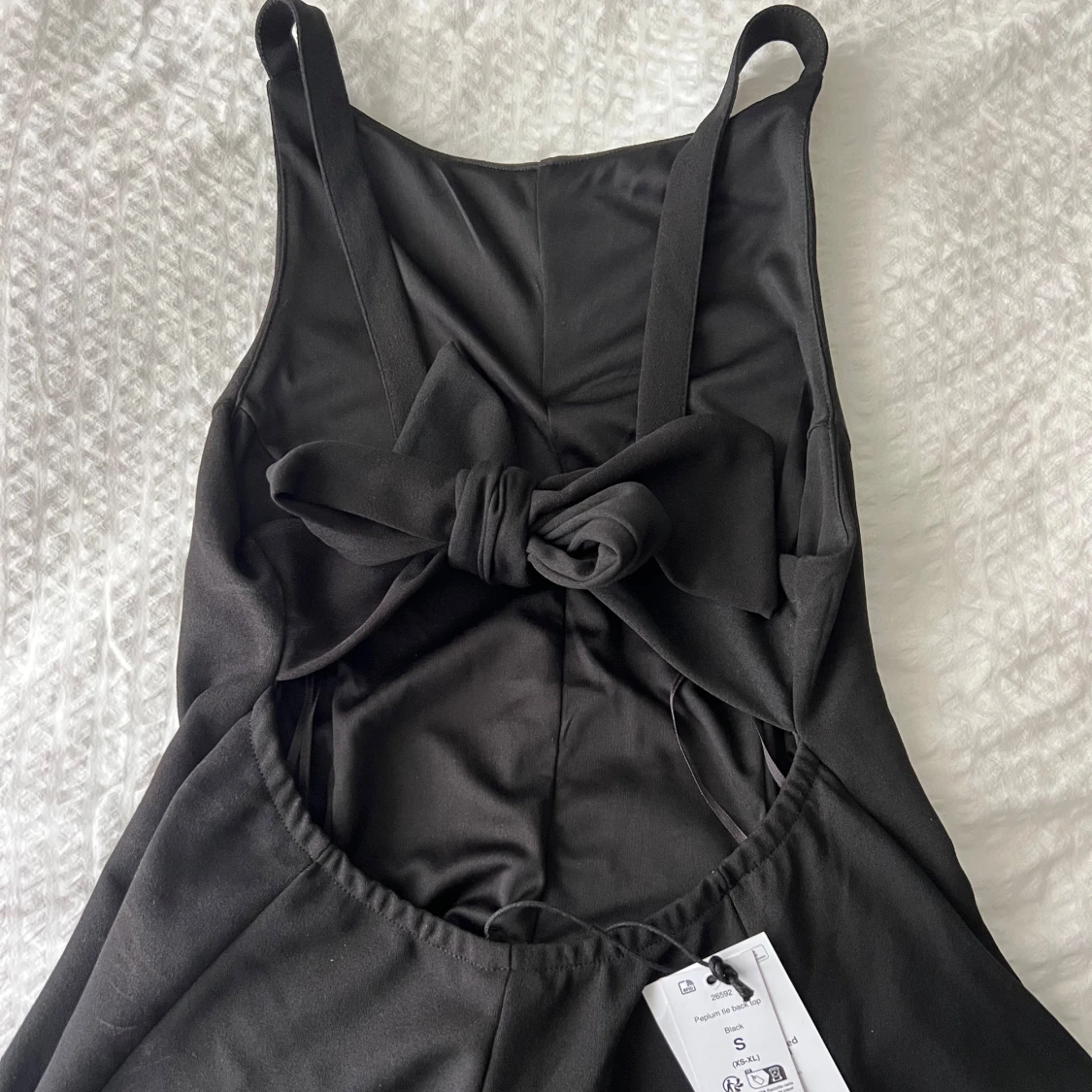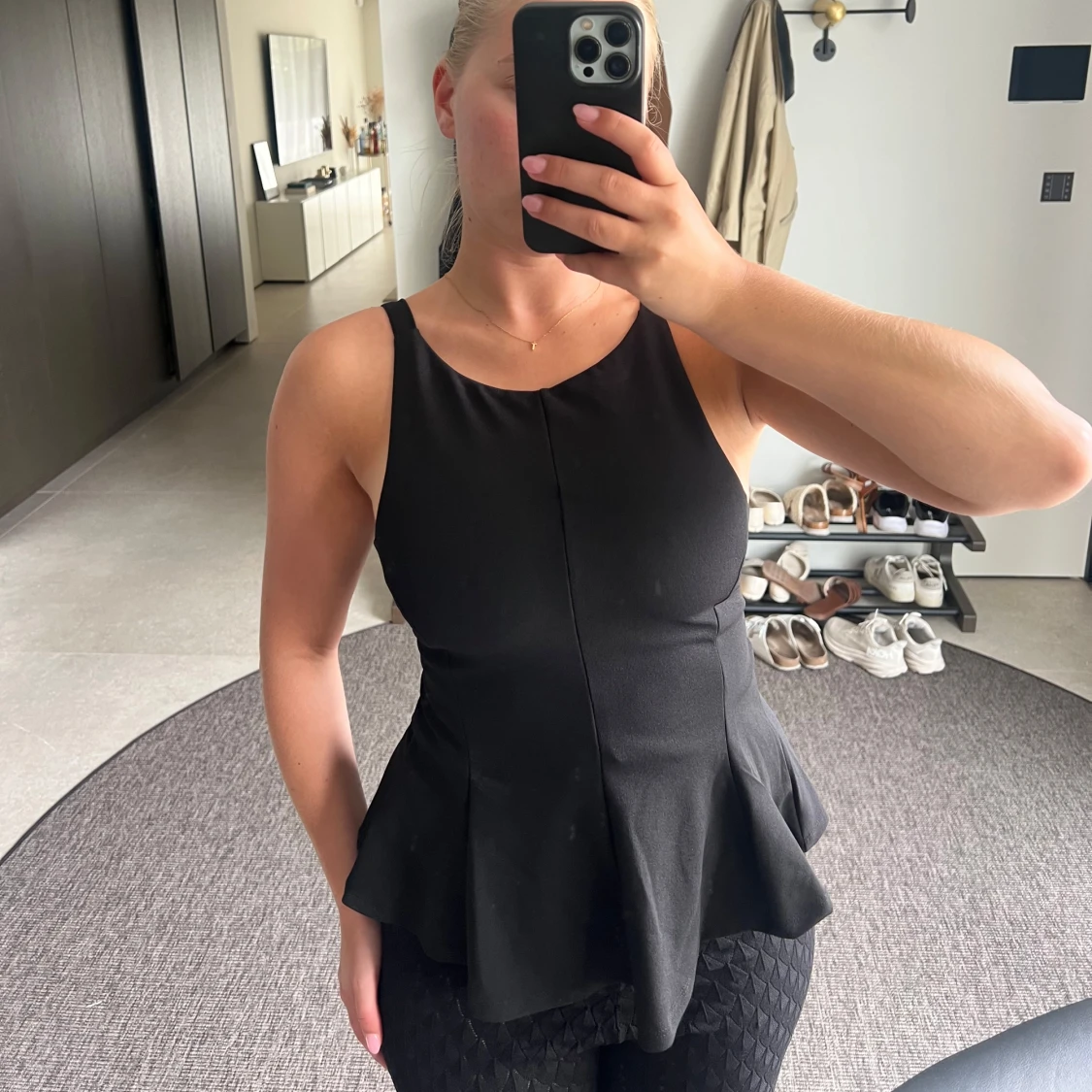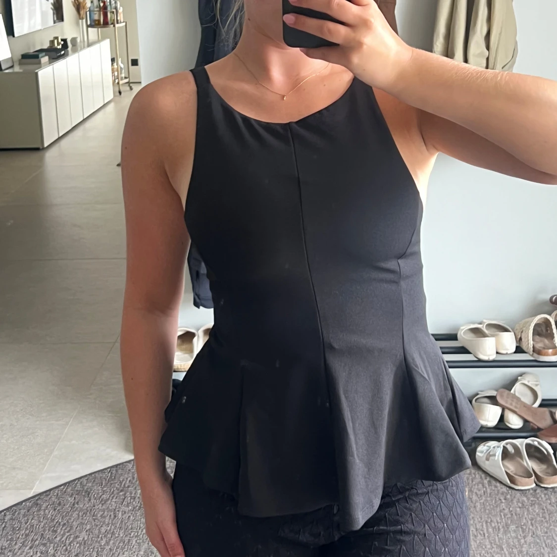 Säljer en svart insvängd topp med breda axelband och snygg volang nertill. Toppen har öppen rygg med en rosett som knyts baktill.