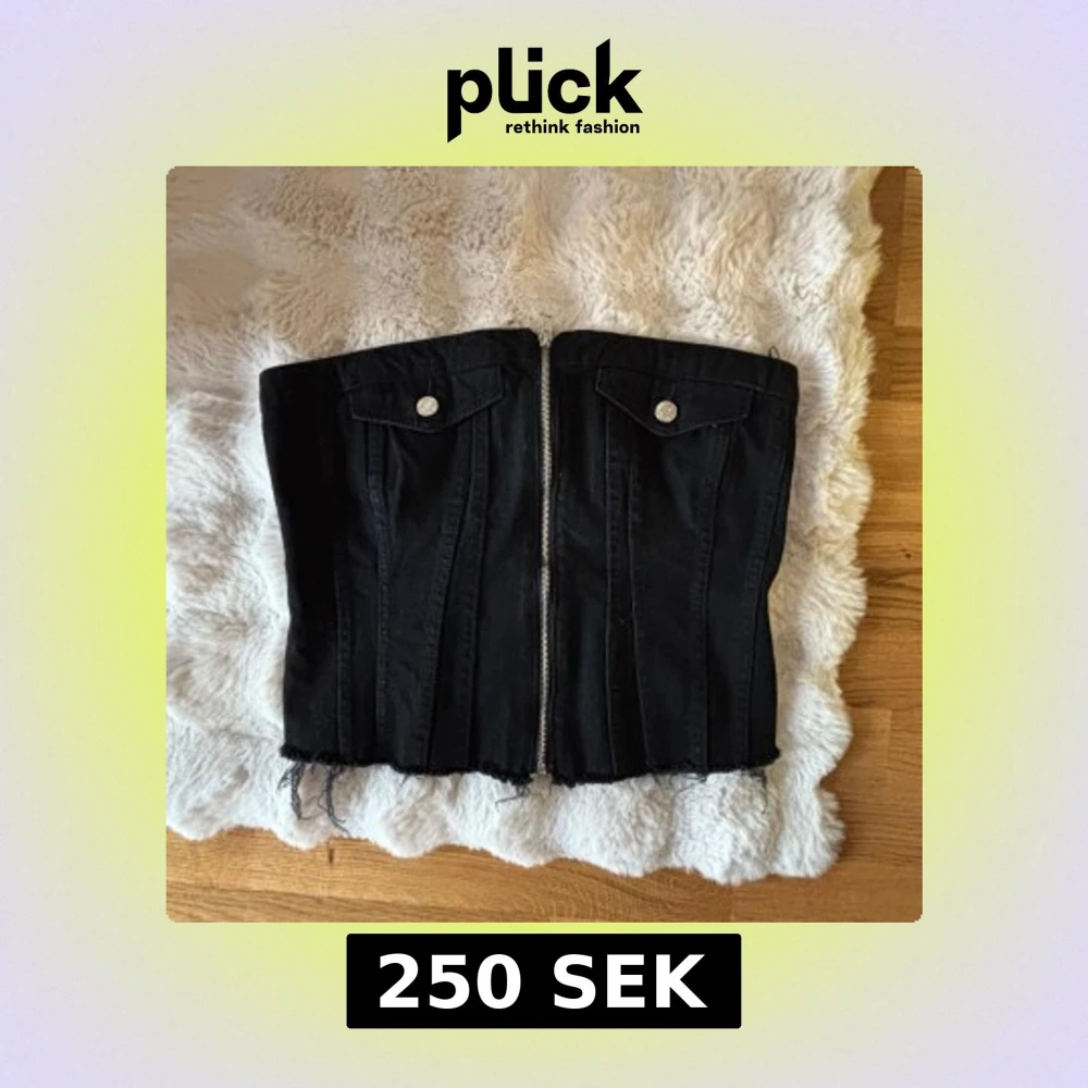 Säljer en korsettopp i jeansmaterial från Zara🖤Toppen har dragkedja framtill, två fickor med knappar och råa kanter nertill. Baksidan har smock för extra stretch och passform. Använd en gång. Storlek L men sitter som en M.