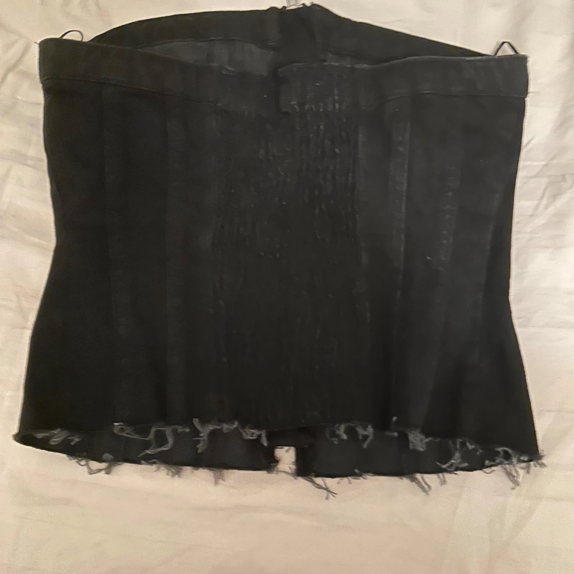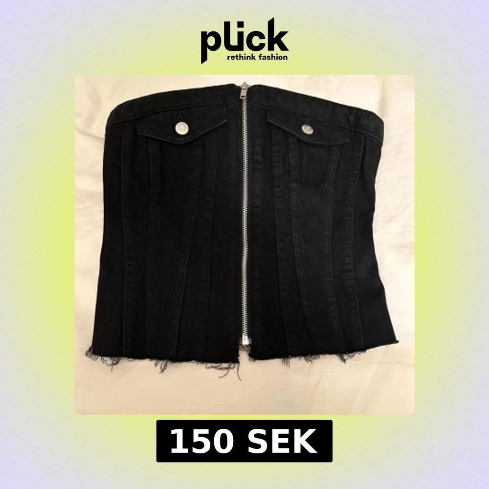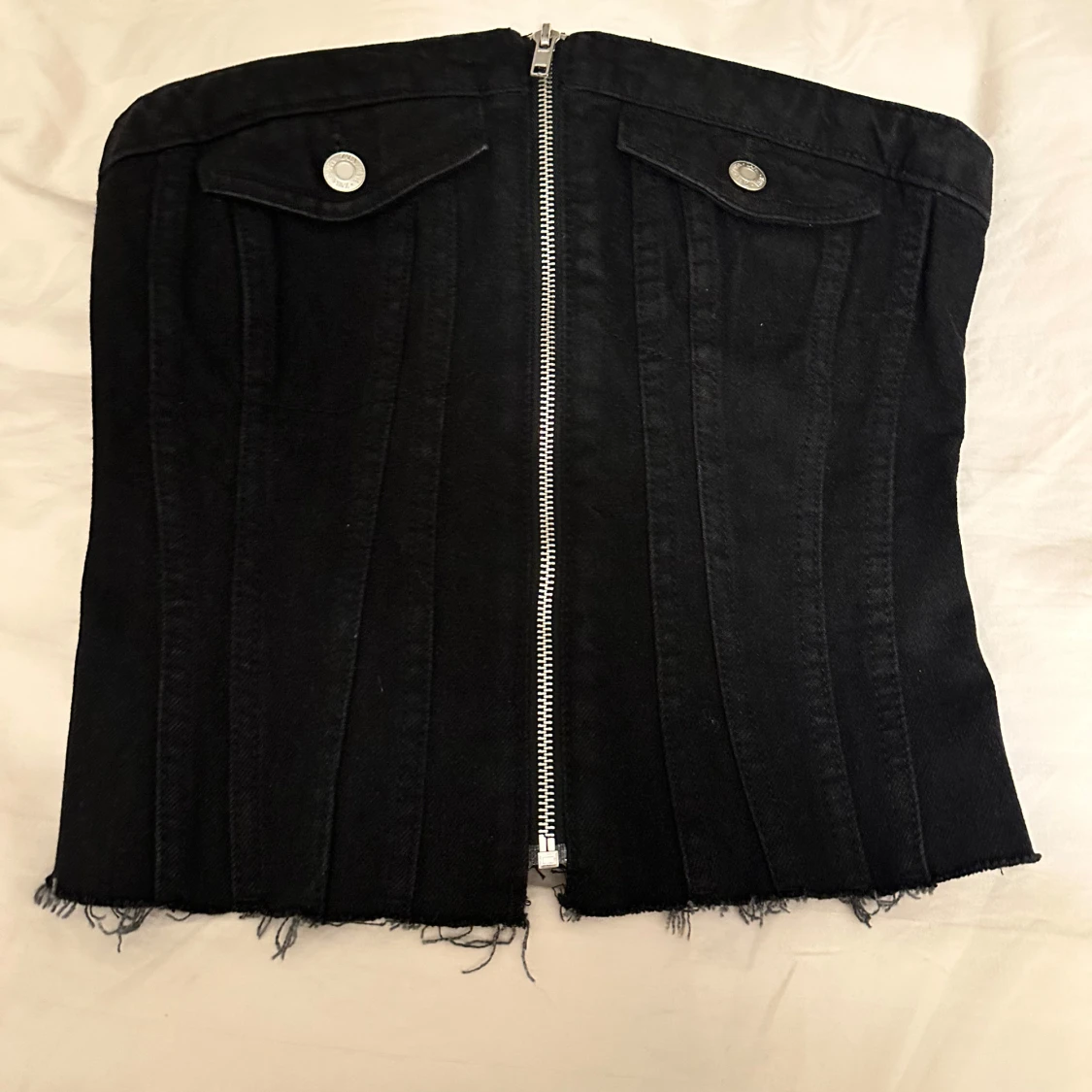Säljer en svart korsettopp i jeansmaterial med silverfärgad dragkedja framtill och två fickdetaljer med knappar. Toppen har råa, fransiga kanter nedtill för en edgy look.