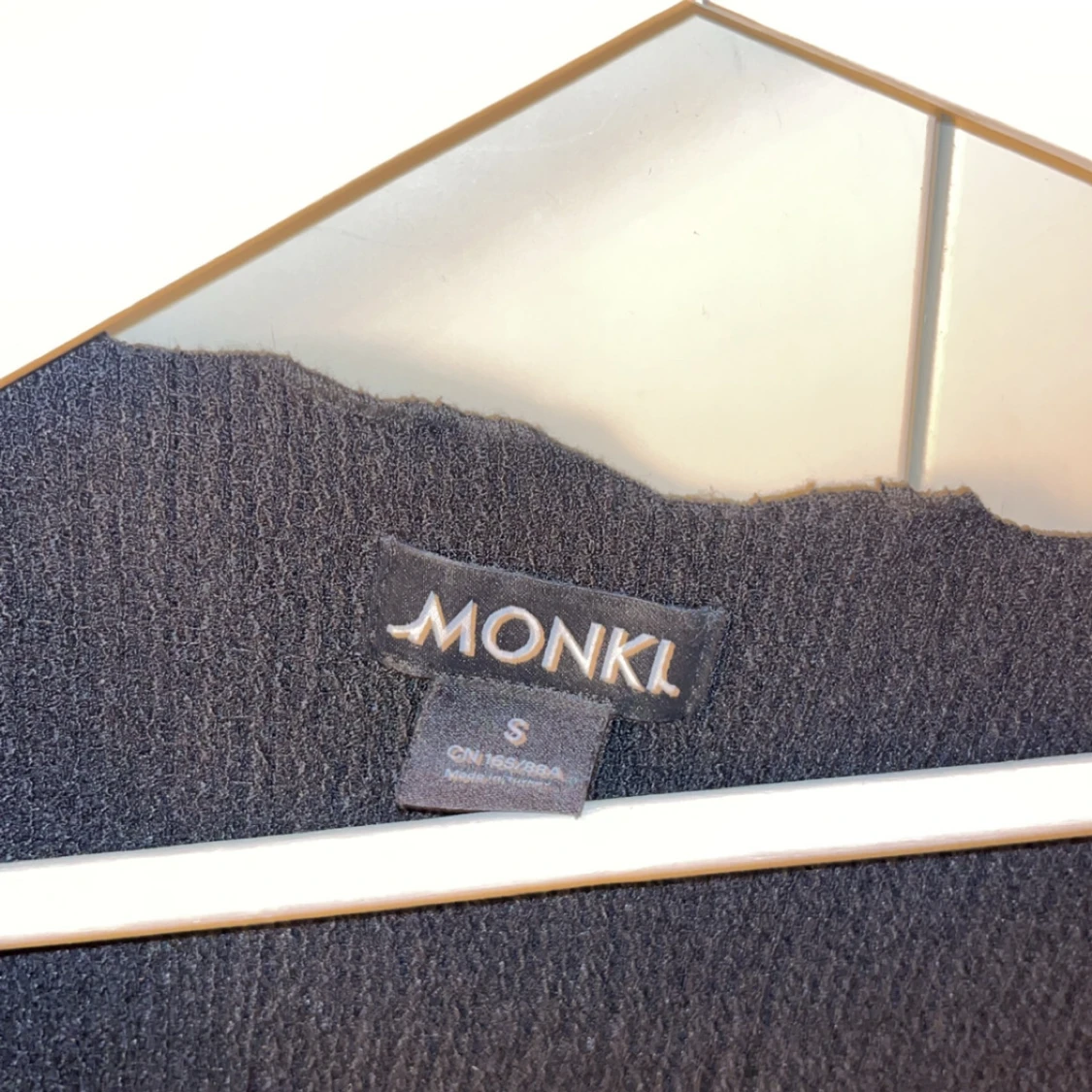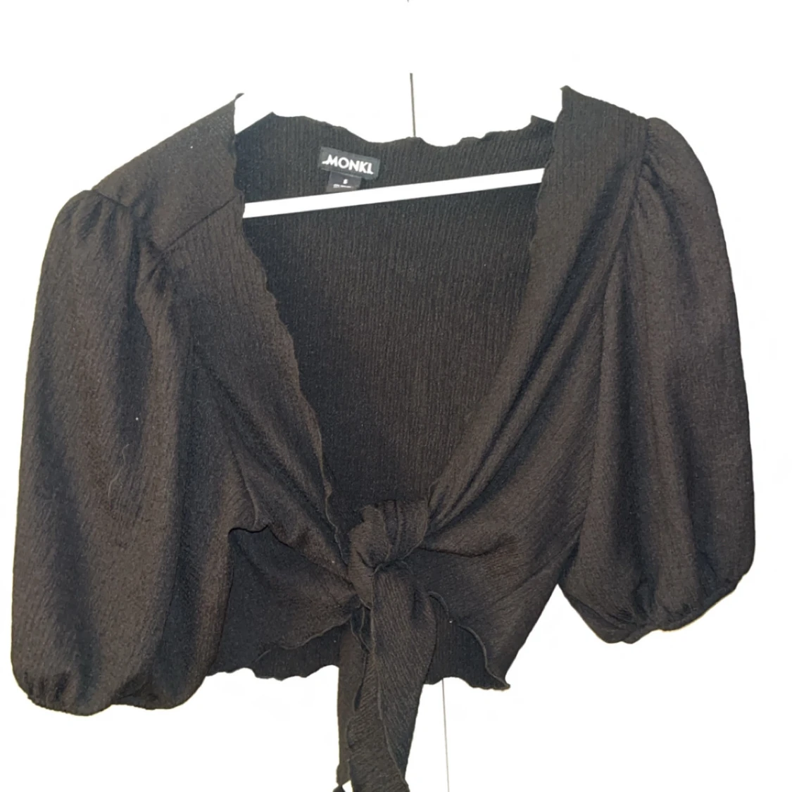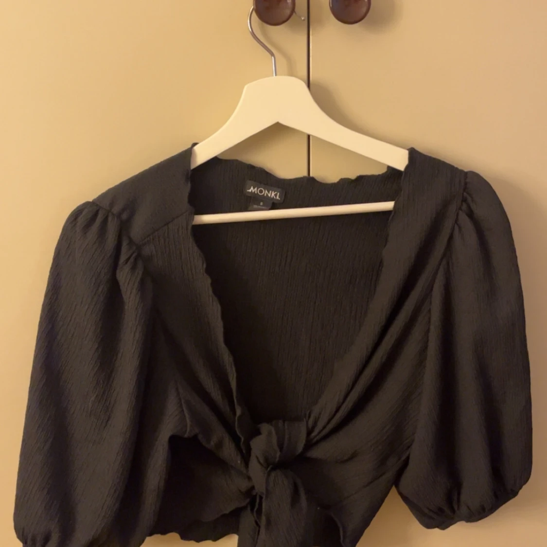 Snygg svart blus från Monki med knytning framtill och puffiga ärmar. Den har en croppad passform och är tillverkad i ett lätt och bekvämt material. Perfekt för en stilren look.