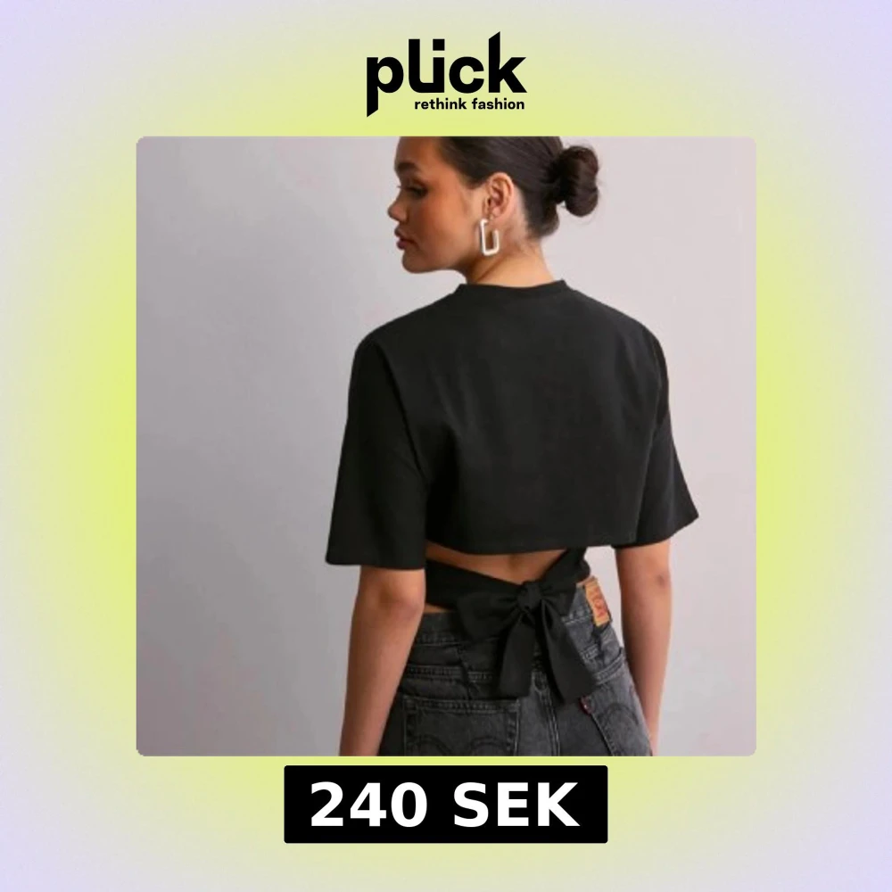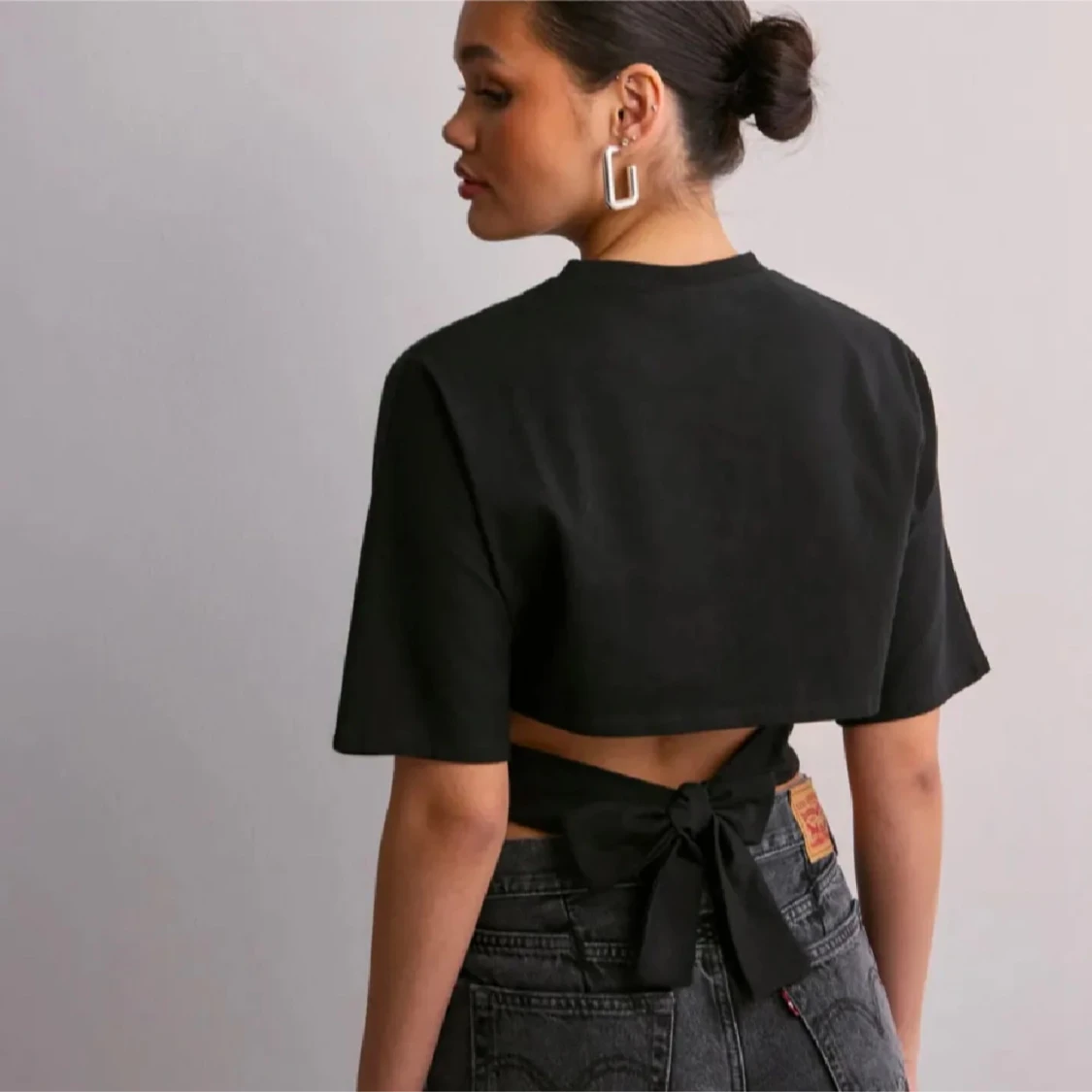 Snygg svart croppad topp med korta ärmar och knytning i ryggen. Perfekt för en trendig look. Köpt från Nelly, använd en gång. Säljer pga för liten.