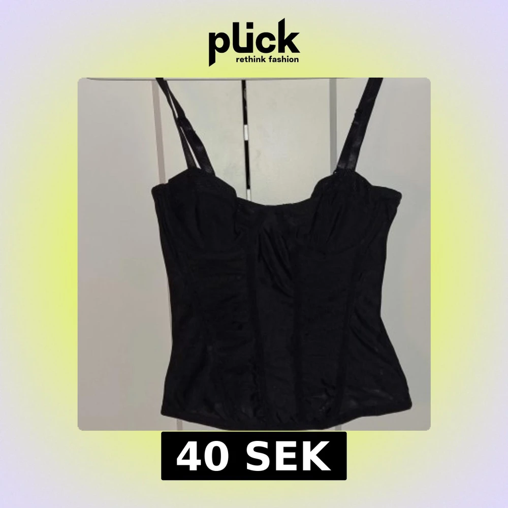 Snygg svart korsett från h&m med justerbara axelband och hakknäppning där bak. Tillverkad i ett mjukt och bekvämt material som är lite see through. Säljer då den är för liten för mig, hade behålla den annars då den är jättefin🥹