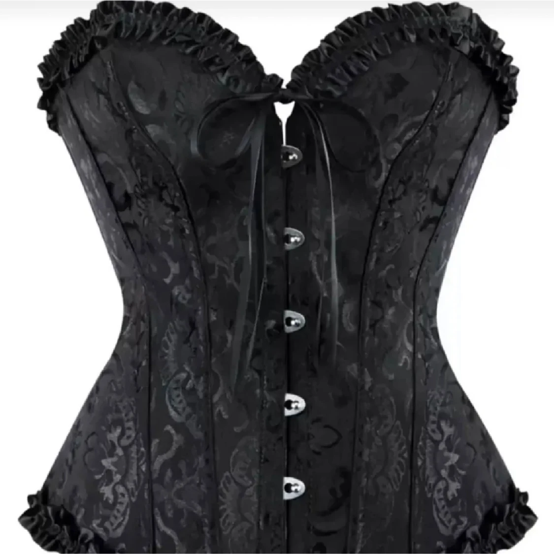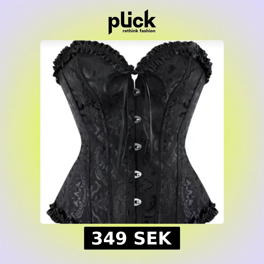 Säljer en svart korsett med snyggt blommigt mönster och dekorativa knappar framtill. Toppen har en söt rosett vid halsen och volangkant längs överdelen. Perfekt för dig som vill ha en statement piece i garderoben!