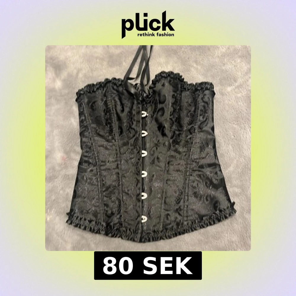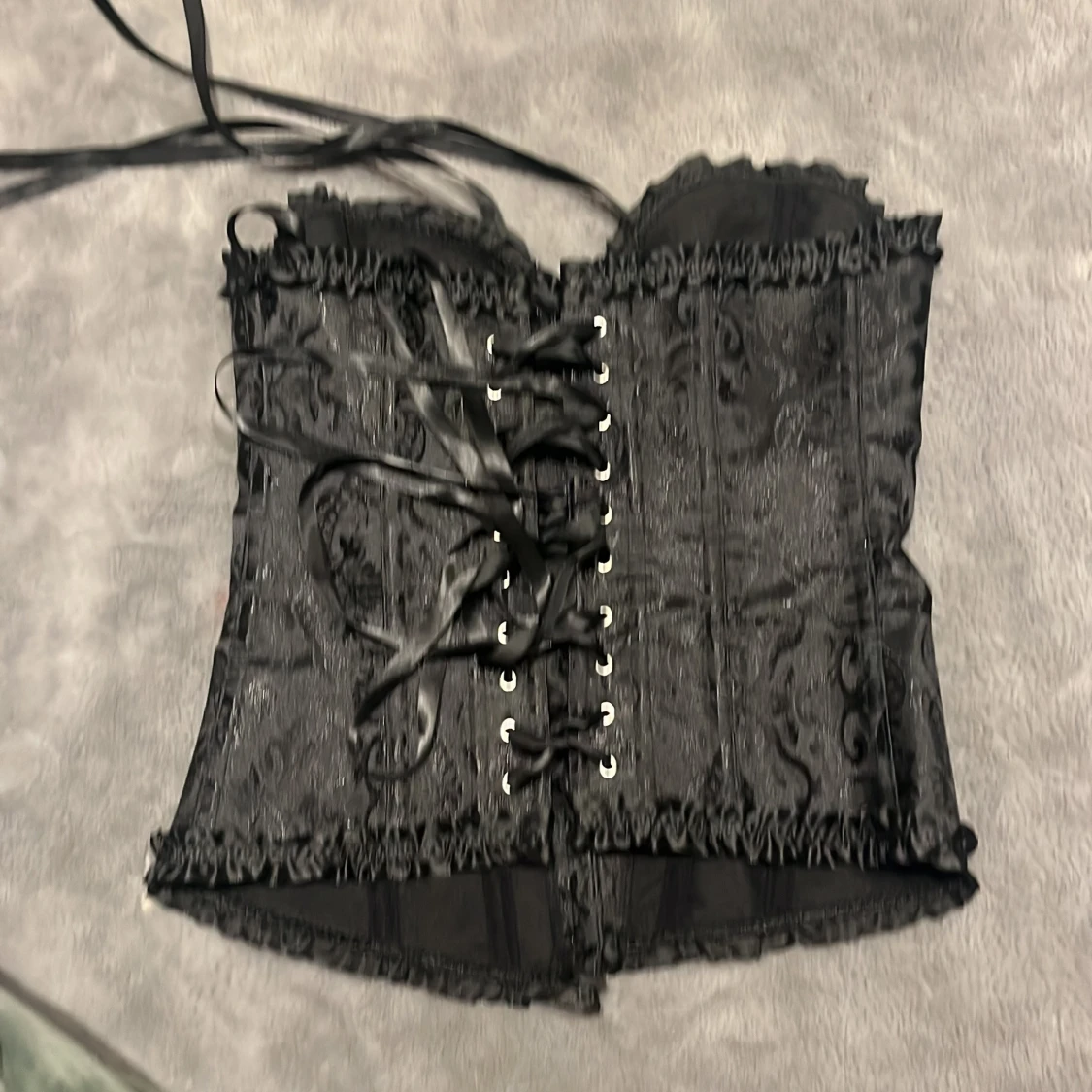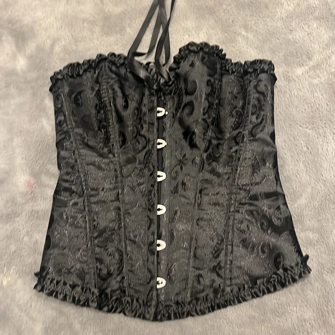 Snygg svart korsett med dekorativt mönster och knappar framtill. Den har snörning bak för justerbar passform och volangdetaljer längs kanterna. Perfekt för en elegant look.