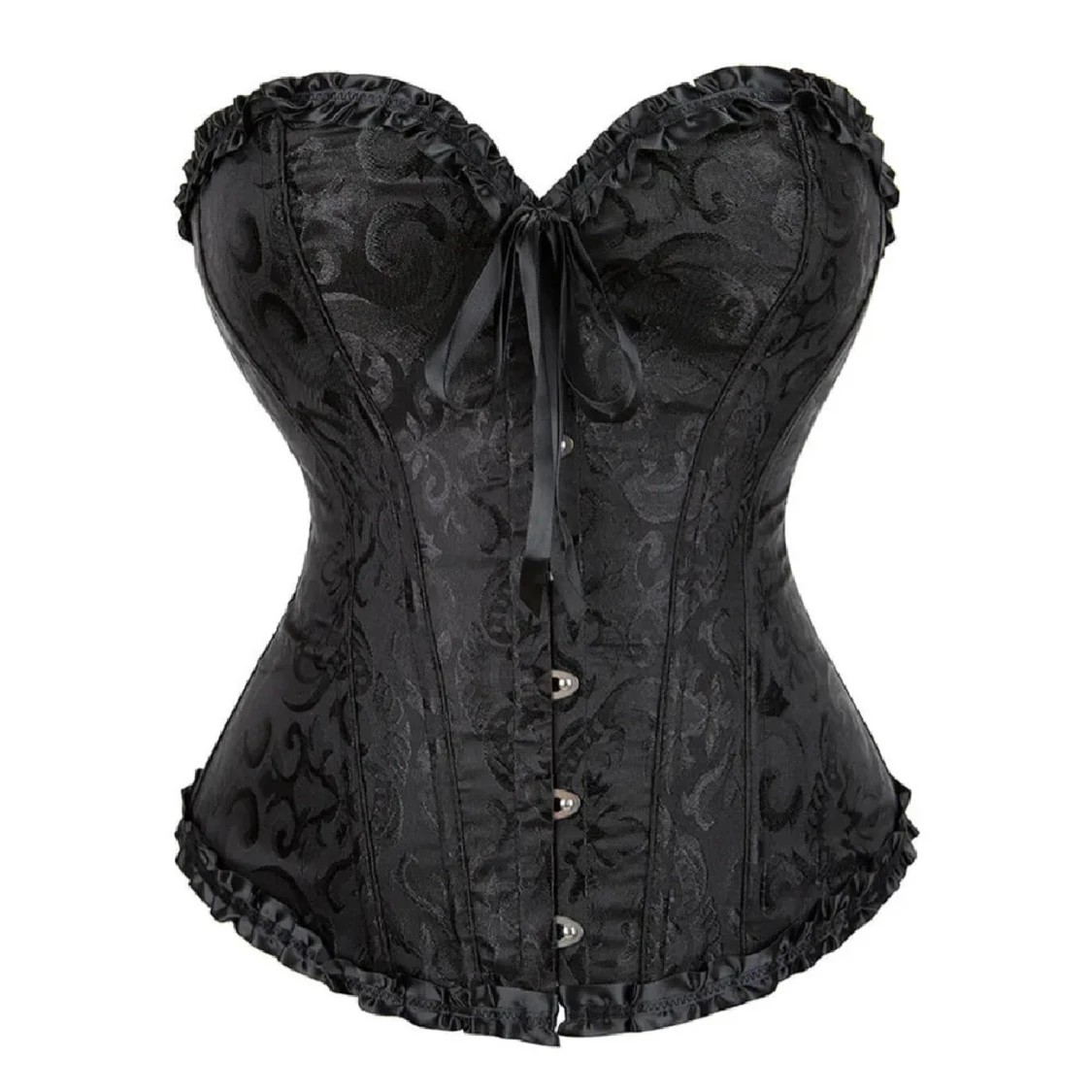 Säljer en svart korsett med snyggt broderat mönster och glansig finish. Toppen har snörning framtill, dekorativa knappar och volangkant upptill och nedtill. Perfekt för dig som vill ha en statement piece med cool siluett och detaljer.