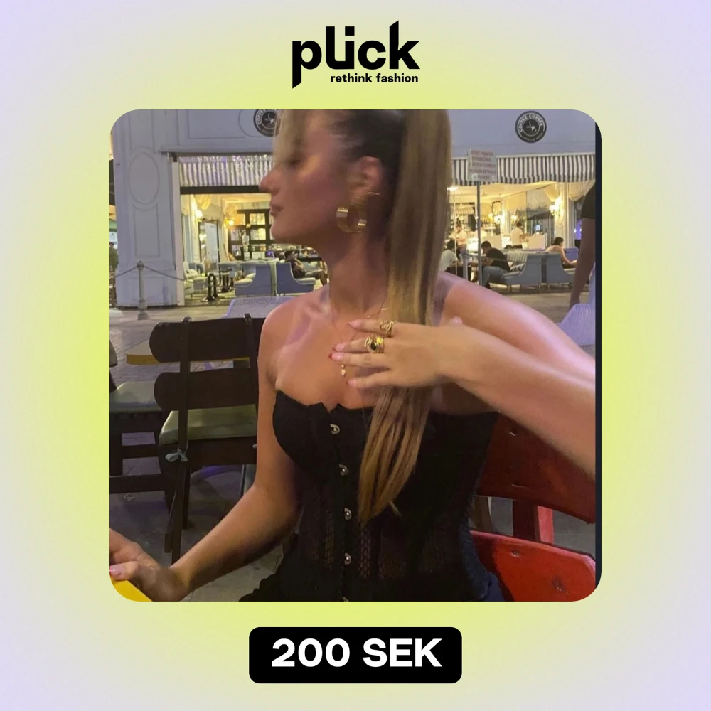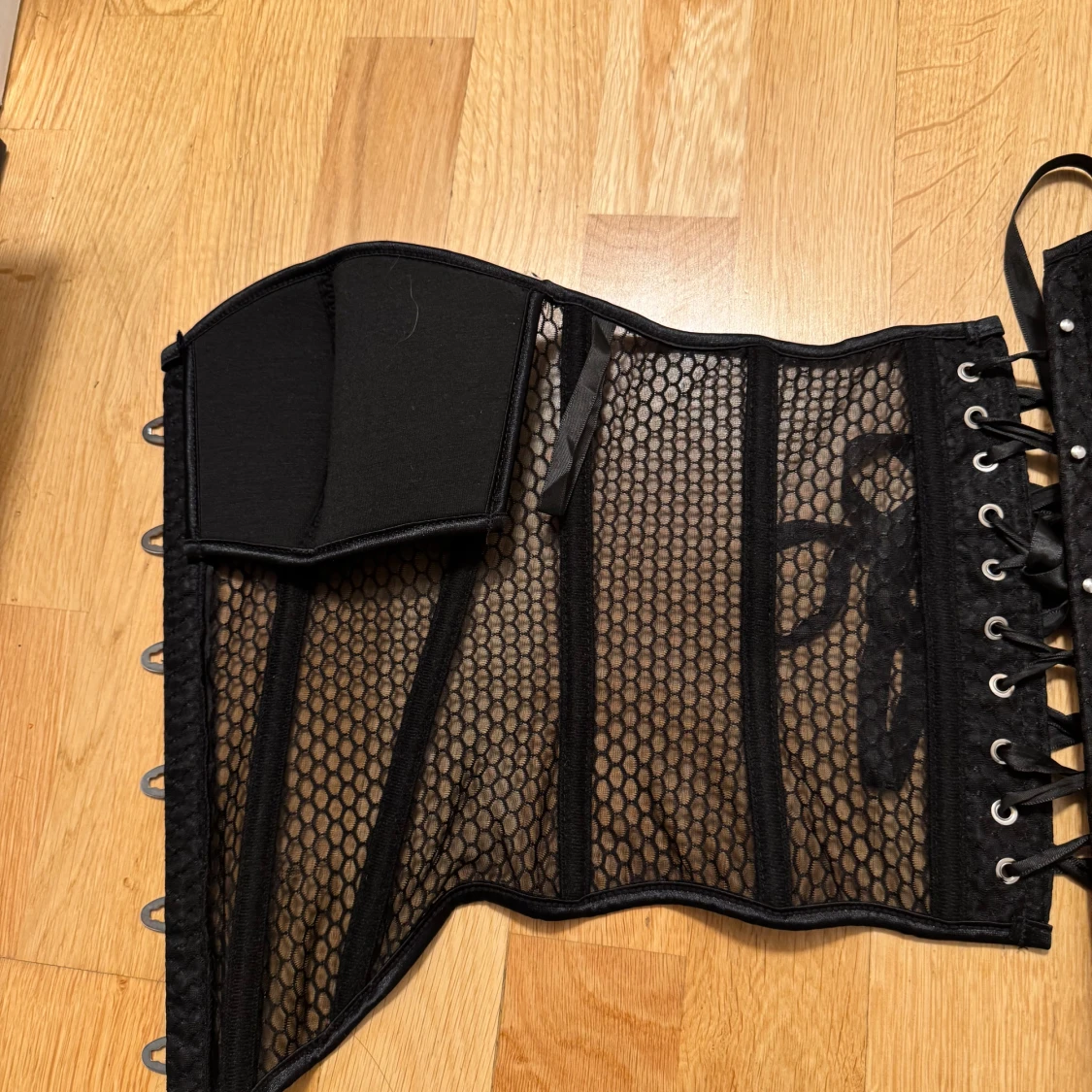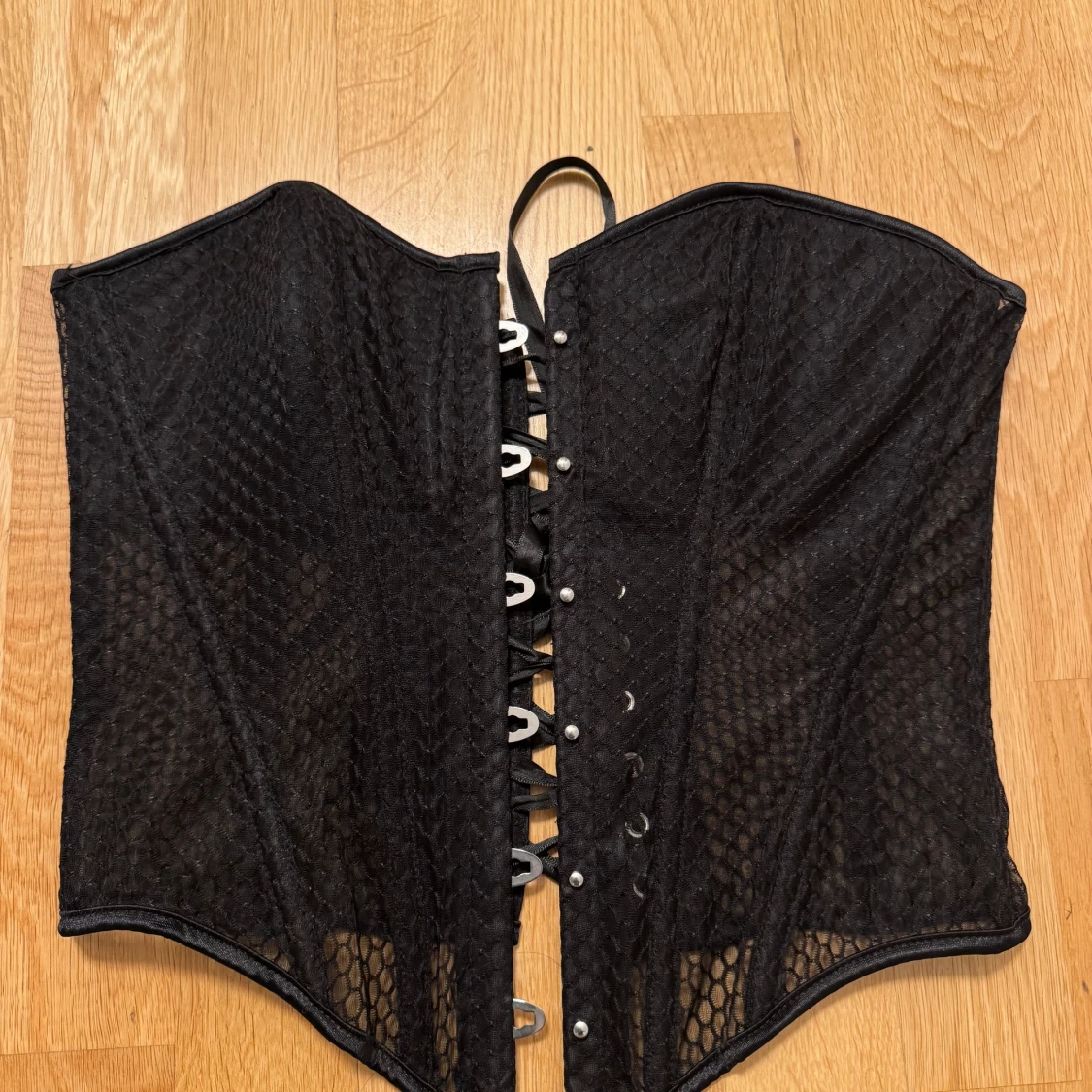 Snygg svart korsett i mesh med snörning bak och hakar fram. Perfekt för en utekväll, fest eller NYÅR✨. Den har en stilren design med ett genomskinligt mönster som ger en edgy look. Passar bra till både jeans och kjol för en cool outfit.