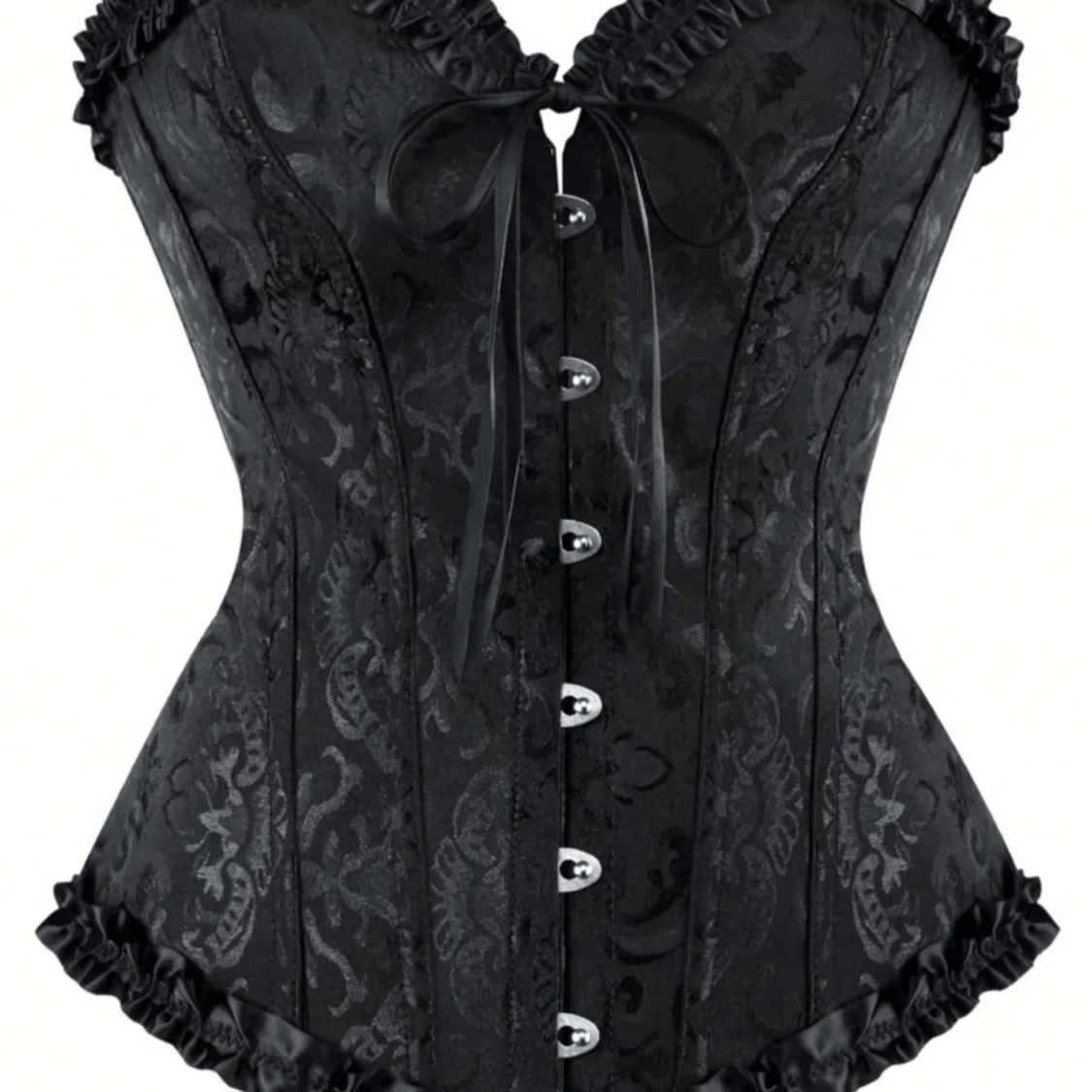 Säljer en svart korsett med vackert broderat mönster, volangkant och söt rosett framtill. Korsetten har metallknäppning framtill och snörning i ryggen för perfekt passform. Materialet är glansigt och ger en lyxig känsla.