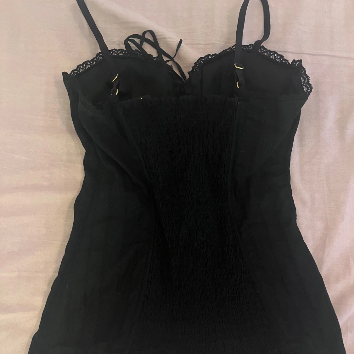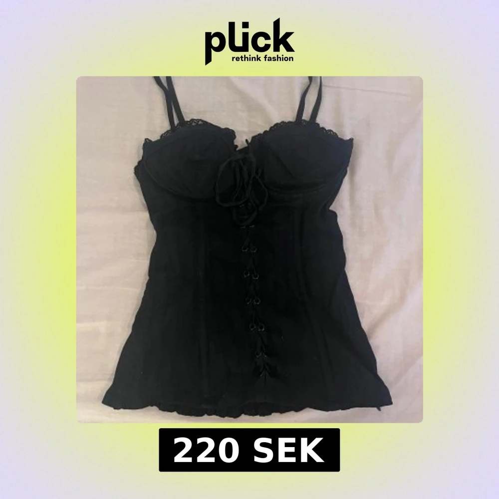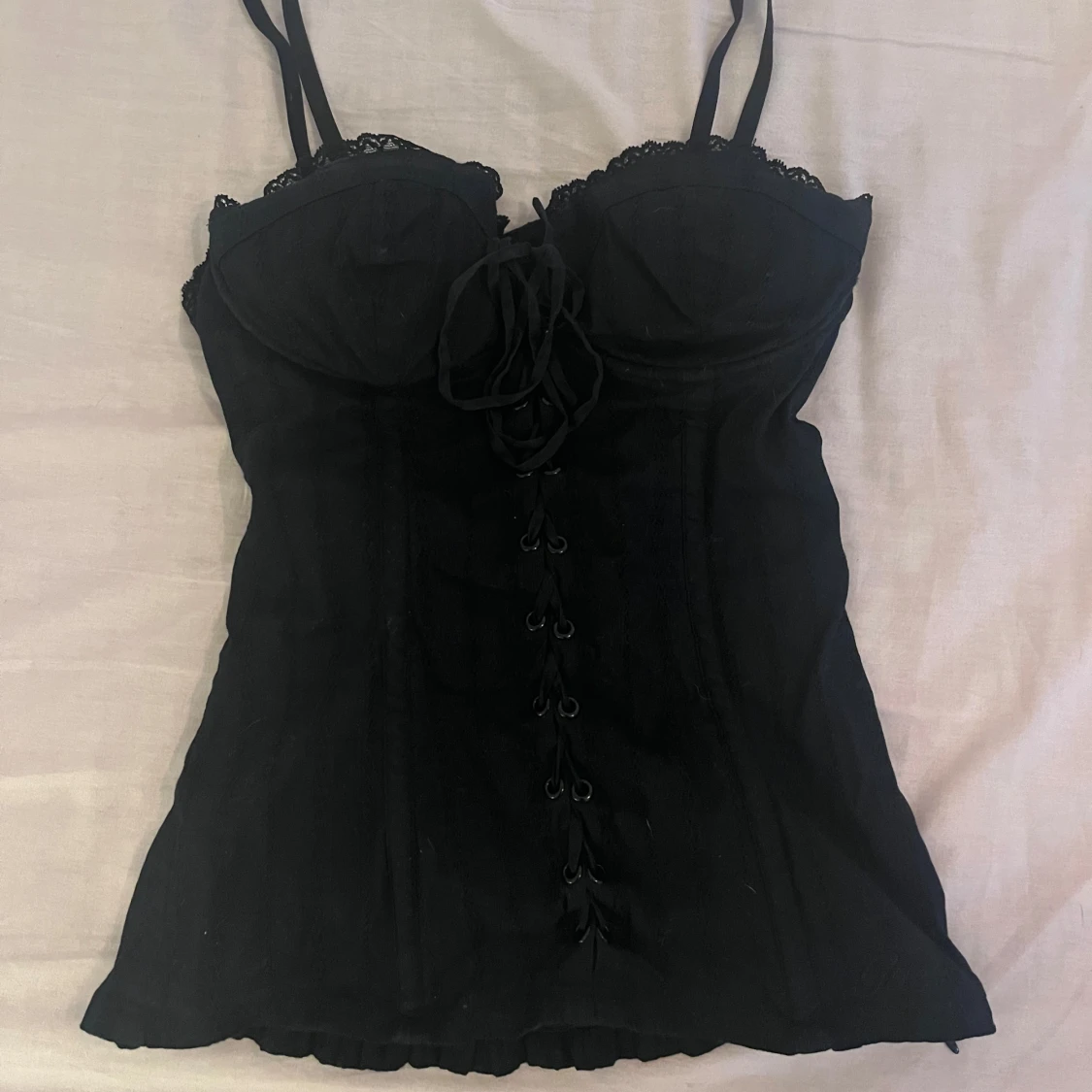 Super snygg svart korsett med spetsdetaljer och snörning framtill. Den har justerbara axelband!!