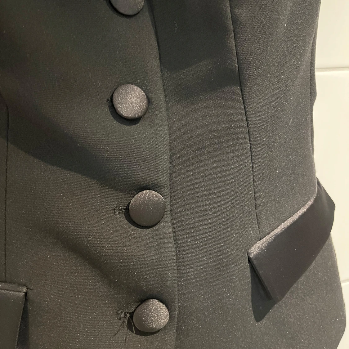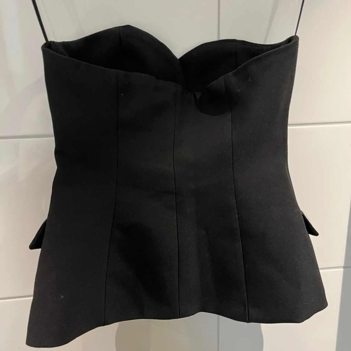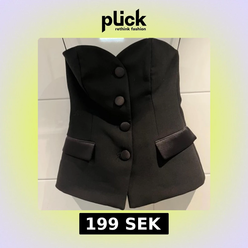 Säljer en svart korsett-topp från Zara med snygga stora knappar framtill och dekorativa ficklock i satin. Toppen är axelbandslös och har en figurnära passform som ger en elegant siluett. Perfekt för att lyfta vilken outfit som helst!