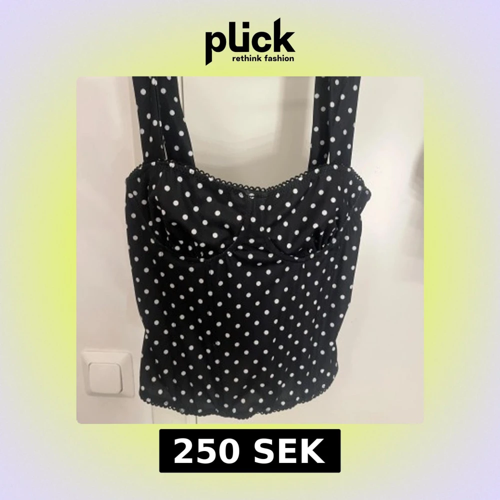 Säljer en svart korsett-topp med vita prickar och breda axelband. Toppen har markerade kupor, dekorativ spetskant upptill och knäppning med hyskor baktill. Materialet känns mjukt och följsamt, perfekt för dig som gillar retrovibbar och coola detaljer.