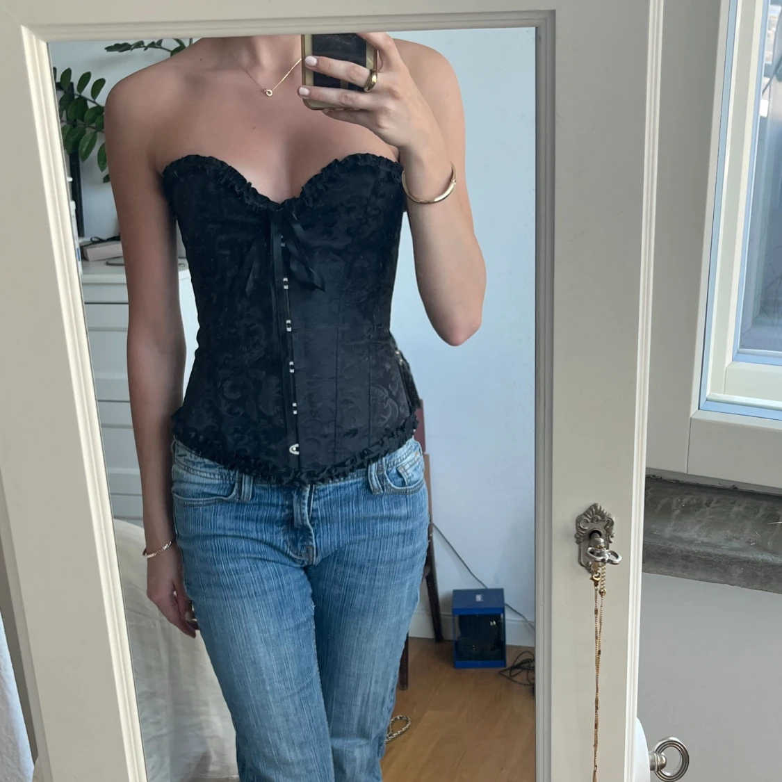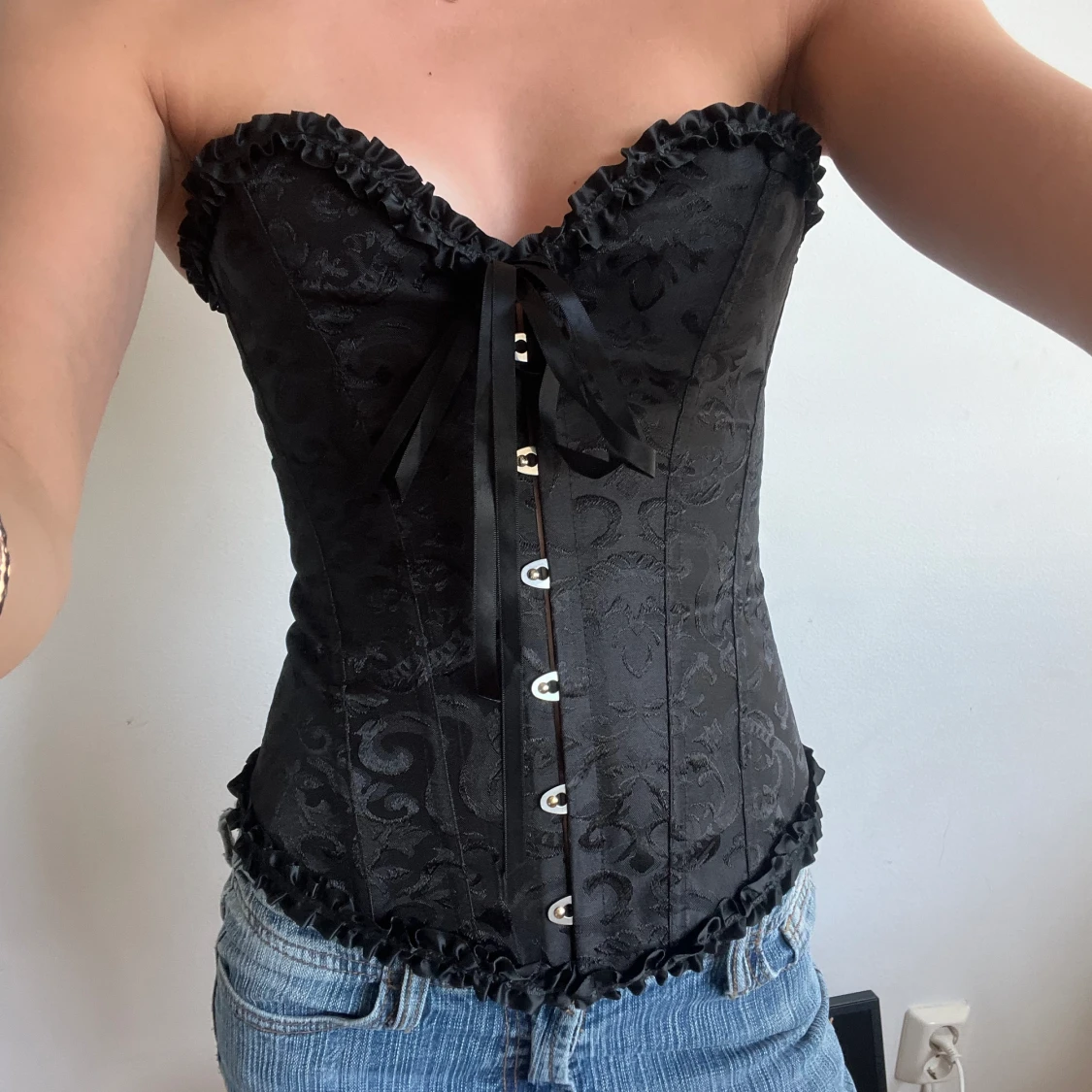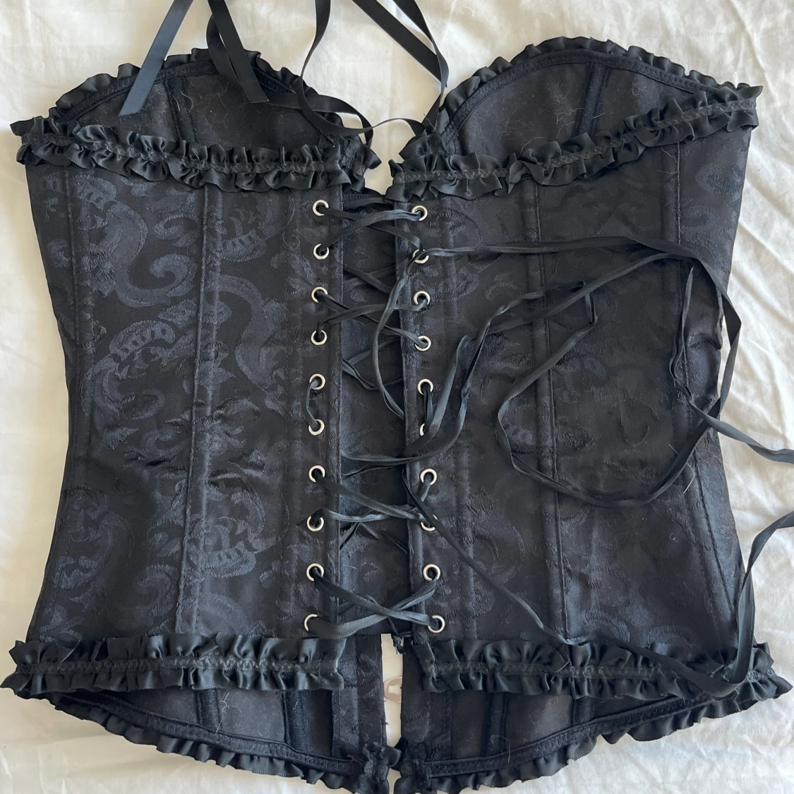 Svart korsett från okänt märke. Köpt på second hand innan men inte märkt några fel och den verkar vara i bra skick. Vet inte heller storlek men den går att justera så skulle gissa på allt ifrån XS-M. Skicka ett meddelande om du har fler frågor. 🥰