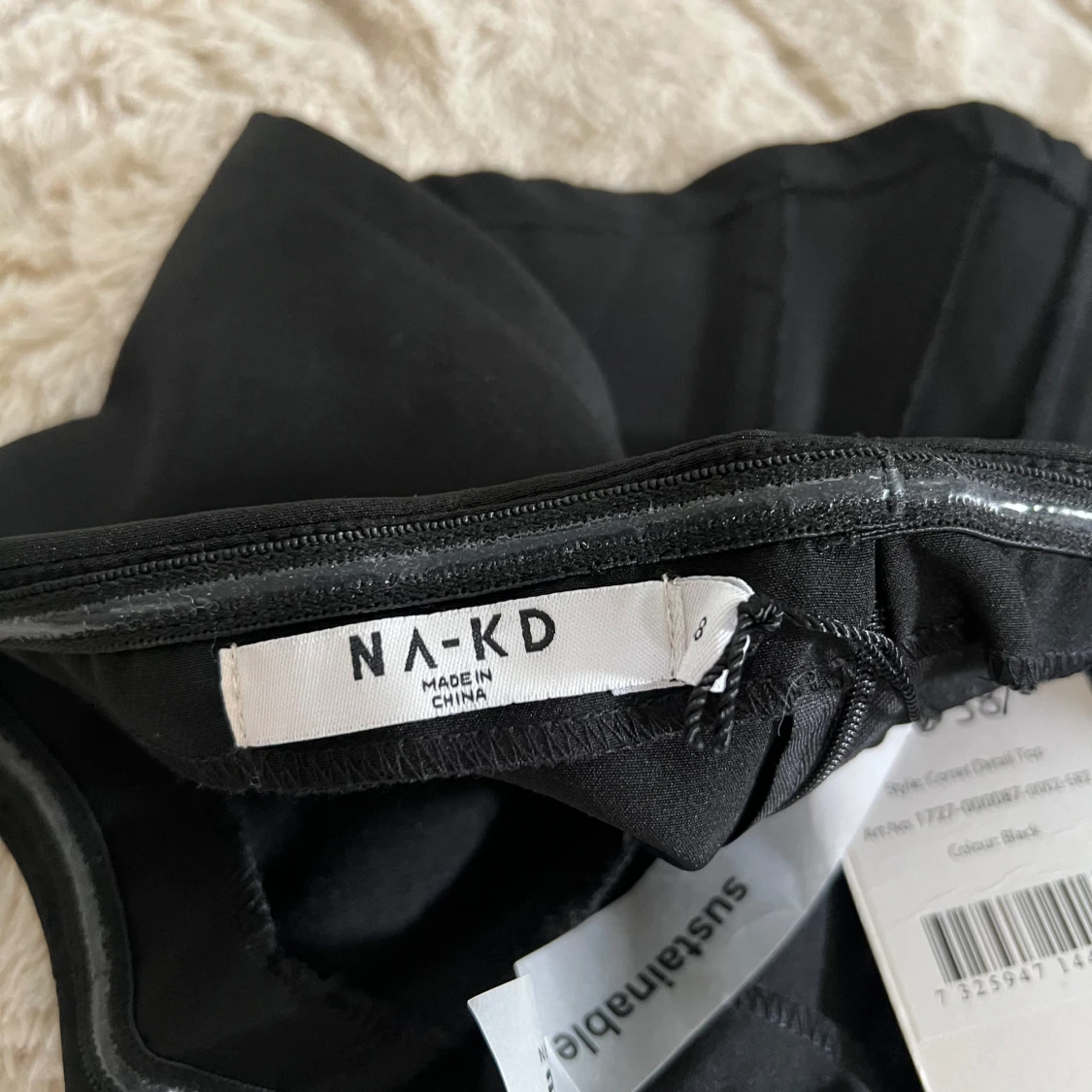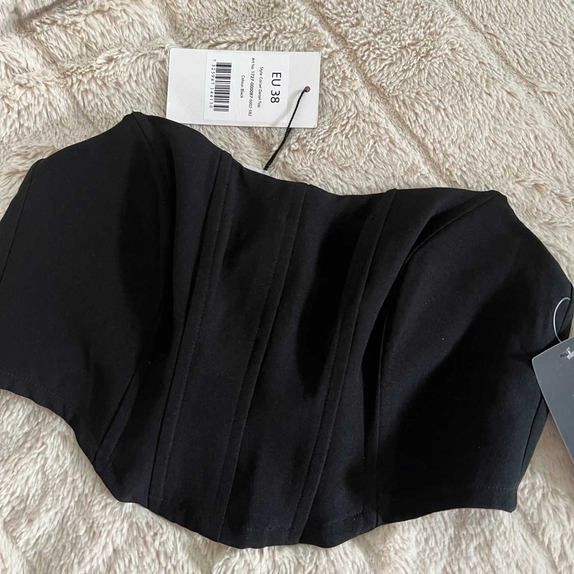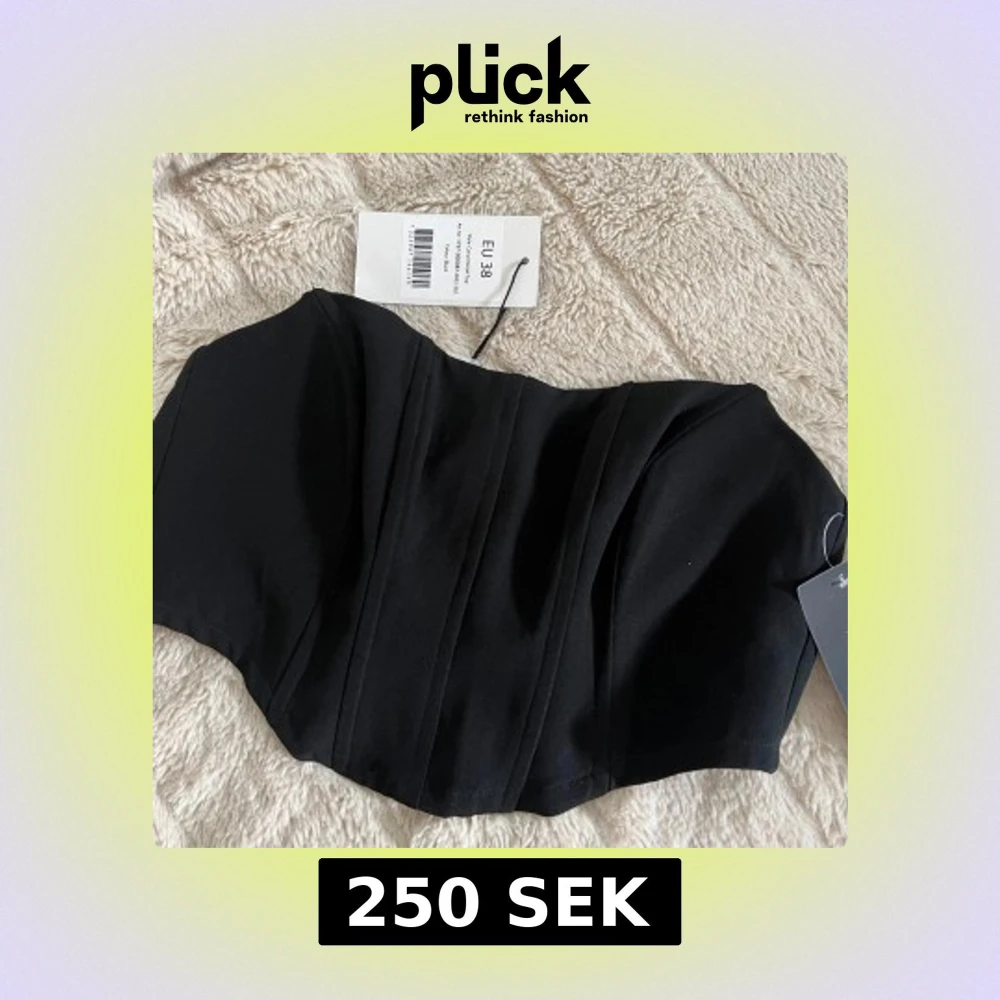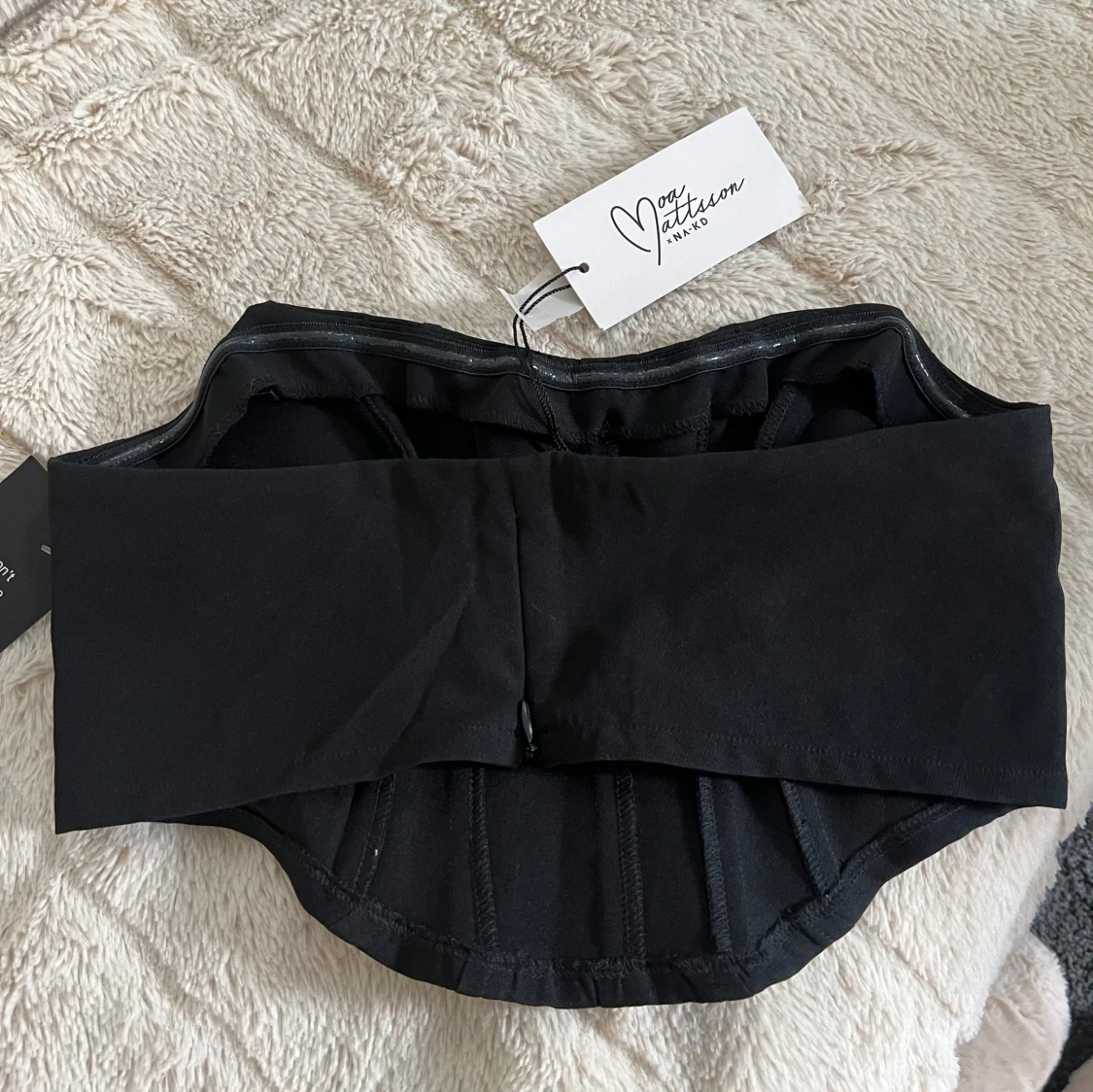 Säljer en svart korsettopp från NA-KD med markerade sömmar och snygg bandeauform. Toppen är axelbandslös och har en stilren, figurnära passform som ger en cool och trendig look. Perfekt att styla med höga jeans eller kjol. aldrig använd.