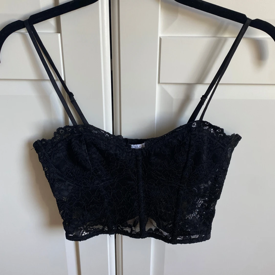 Supersnygg svart korsettopp från Zara i spets med tunna axelband och croppad passform. Den är i storlek s men jag skulle säga att den är liten i storleken och snarare en xs. Perfekt till fest.🤗💛💛
