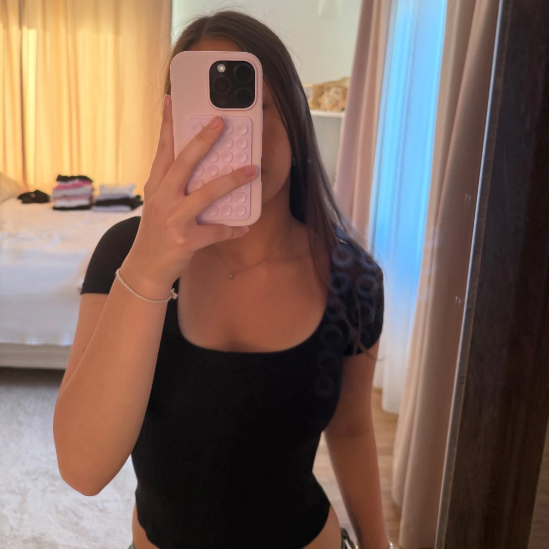 Säljer en svart, tight topp med korta ärmar och djup rundad halsringning. Enkel och stilren design som sitter snyggt och framhäver figuren. Perfekt att matcha med jeans eller kjol för en clean look.