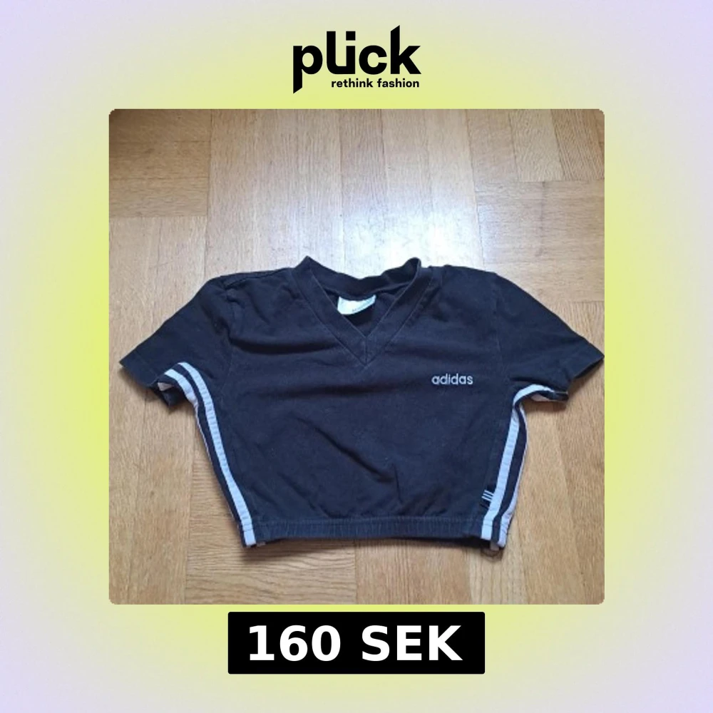 Svart kort topp från Adidas med v-ringning och korta ärmar. Snygga vita ränder längs sidorna och broderad Adidas-logga framtill. Storlek D36 / 38.