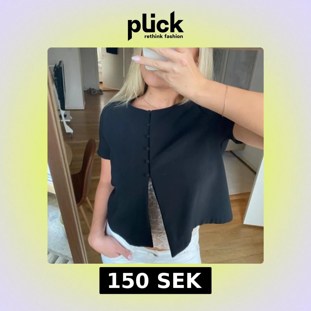 Stilren svart blus med korta ärmar och klädda knappar framtill. Modellen är croppad och har en lätt utsvängd passform med slits framtill. Perfekt att styla över ett linne eller spets-topp.