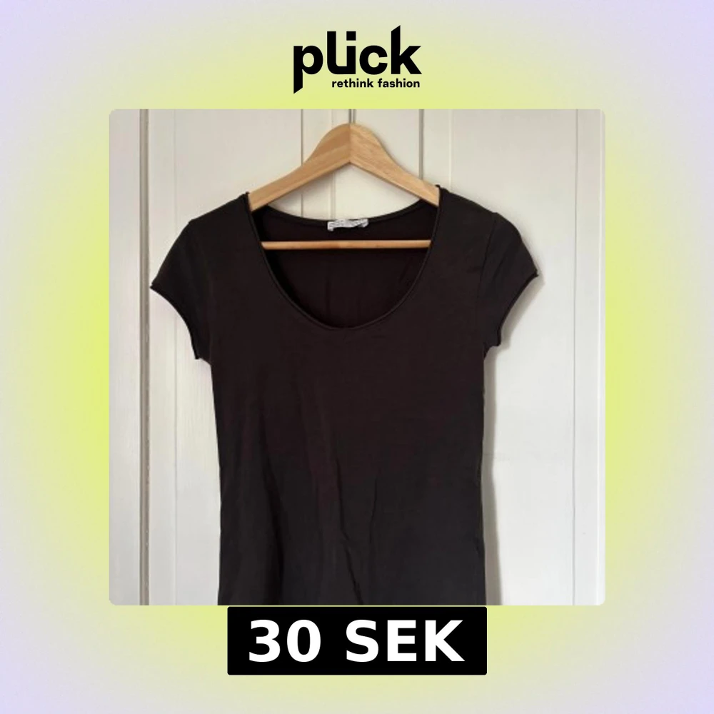 En mörk brun enkel och stilren topp från Zara TRF i ekologisk bomull. Modellen har korta ärmar, rundad djup ringning och en figurnära passform. Perfekt att matcha med jeans eller kjol för en clean look. Mjuk och skön mot huden. Obs! Hund och katt finns i hemmet samt så tvättas plagget innan jag skickar iväg det!