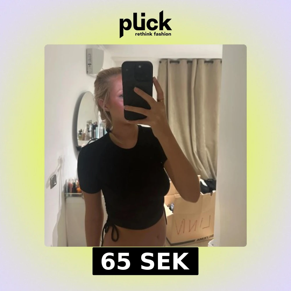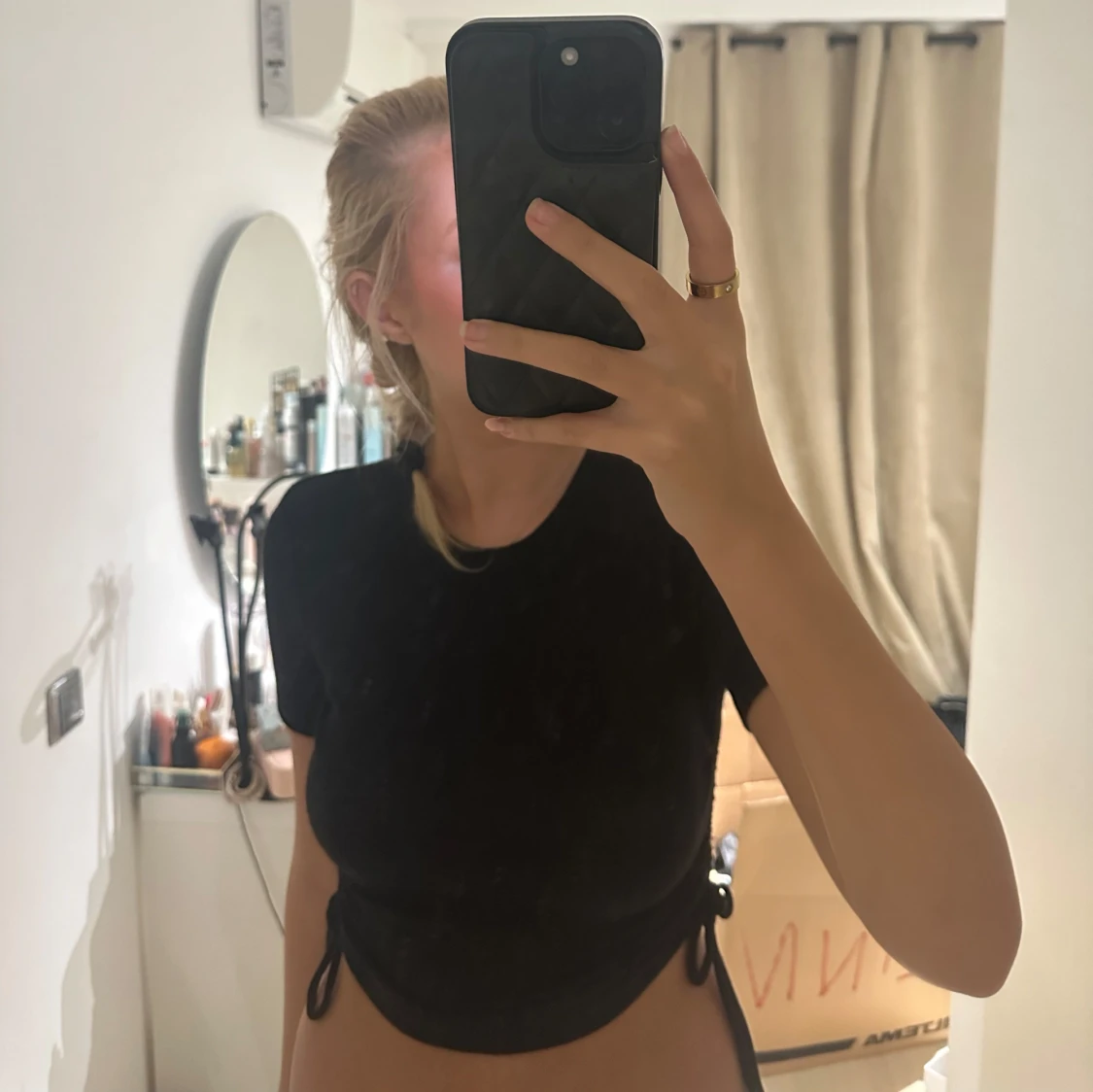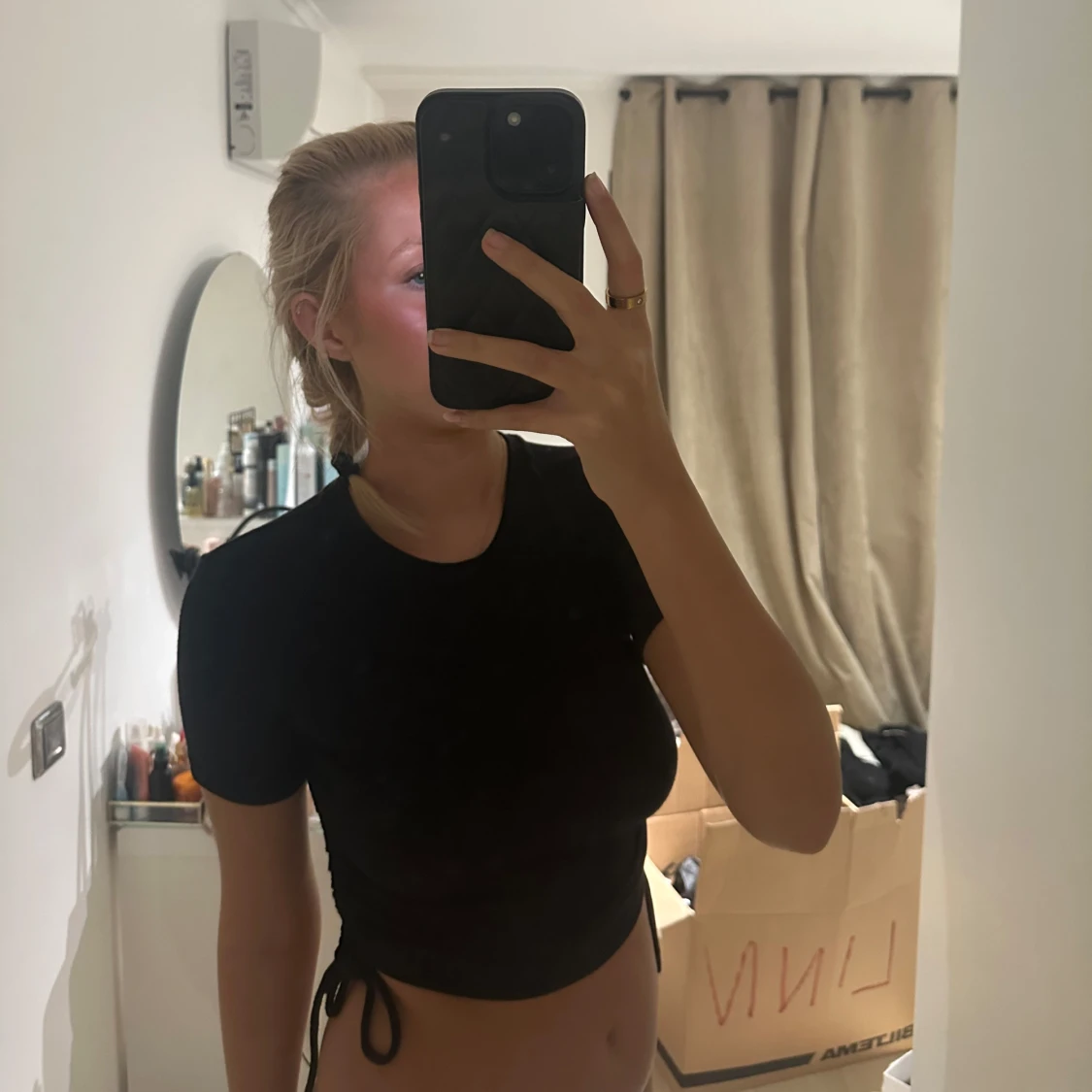 Säljer en svart kortärmad topp med dragsko i sidan. Där man själv kan välja hur kort eller lång man vill att toppen ska vara. Perfekt för en stilren look. Från Zara