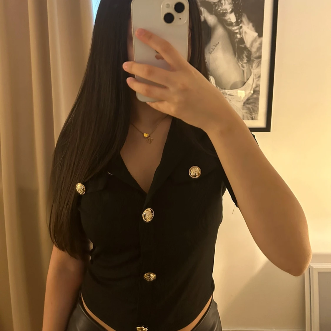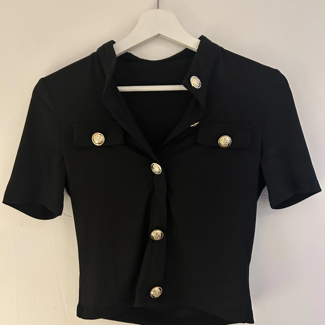 Snygg svart kortärmad topp med dekorativa knappar i guld. Toppen har en v-ringad design och är croppad för en modern look. Perfekt för att ge en stilren touch till din outfit. Den är aldrig använd och i helt nytt skick!