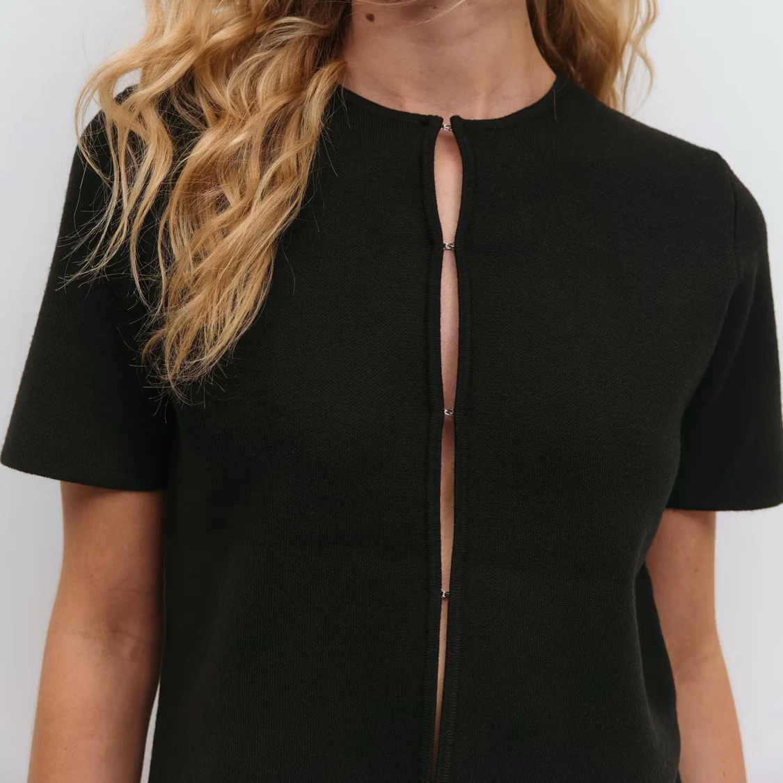 Snygg svart topp med korta ärmar och en unik öppning framtill som hålls ihop med små knappar. Enkel och stilren design som passar dig som gillar minimalistiskt mode. Materialet känns mjukt och har en lätt struktur.