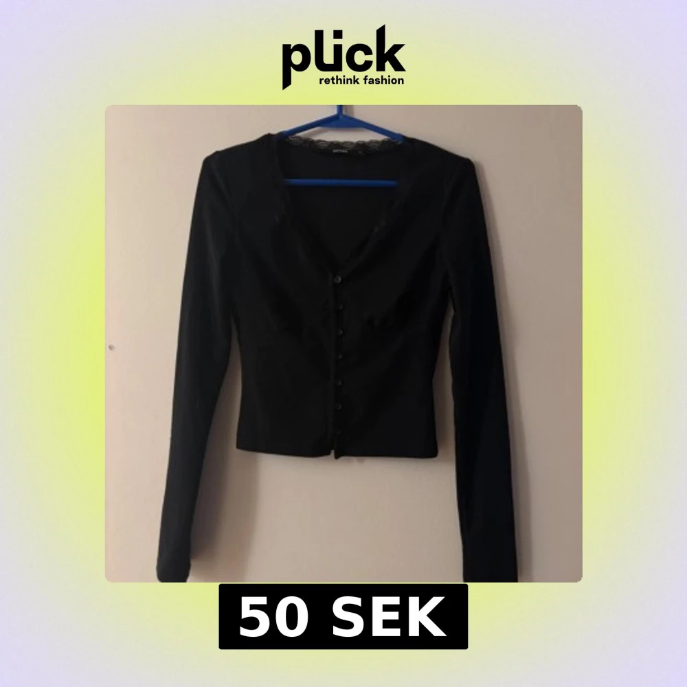 Snygg svart blus från BikBok i storlek XS. Modellen är figurnära med långa ärmar, knappar framtill och v-ringning med spetsdetalj vid halsen. Perfekt att styla med jeans eller kjol för en trendig look.