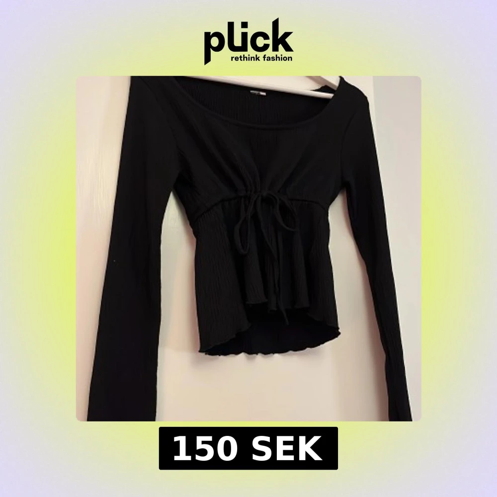 Svart blus med lång ärm och snygg knytning framtill. Toppen har en lätt rynkad struktur och en något croppad passform med vågig kant nedtill. Perfekt för dig som gillar stilrena och trendiga plagg med lite extra detalj.