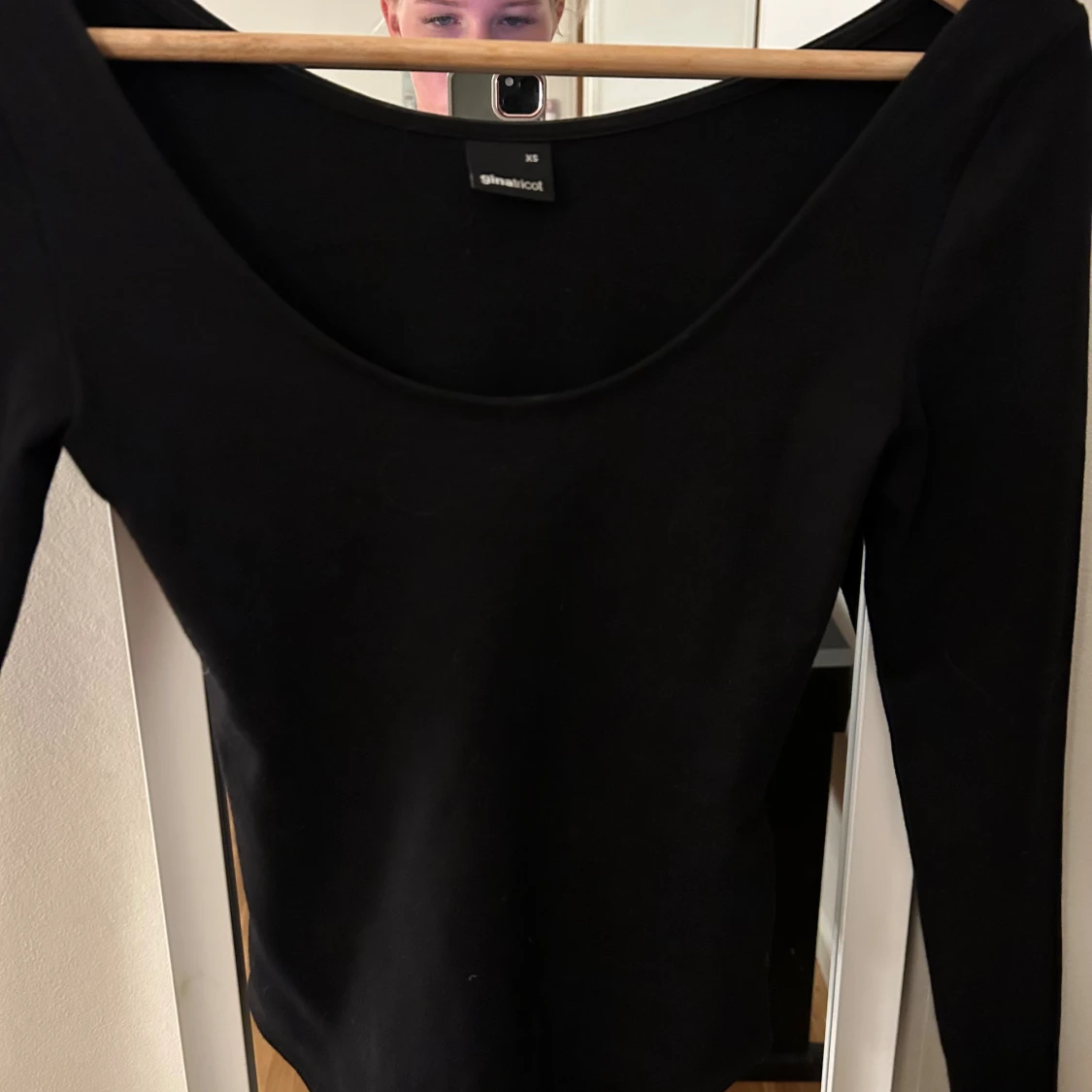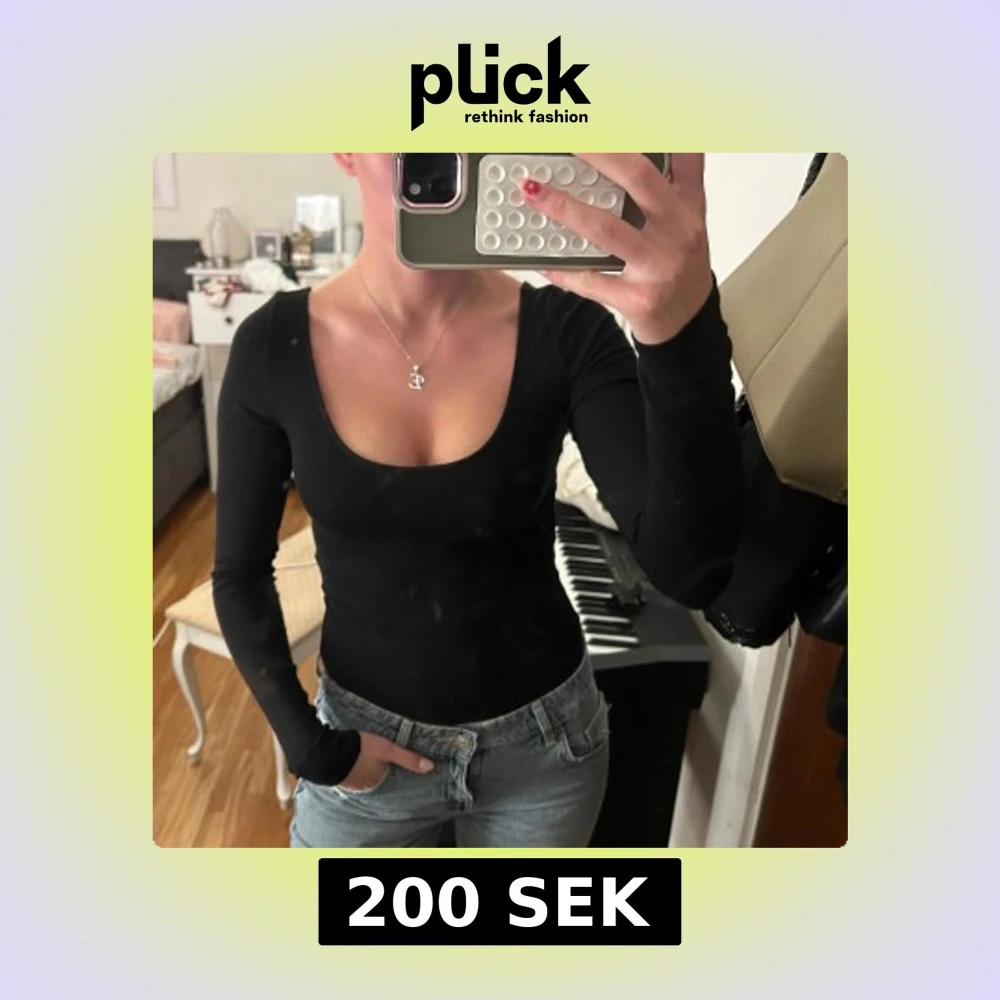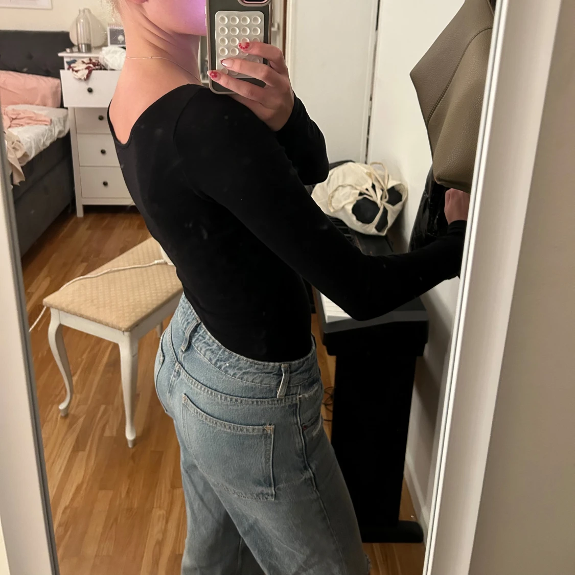 En svart långärmad body från Gina Tricot med djup rundad urringning. Modellen är tight och sitter snyggt mot kroppen. Perfekt att styla med jeans eller kjol för en clean look. Gjord i mjuk bomullsmix som känns skön hela dagen.