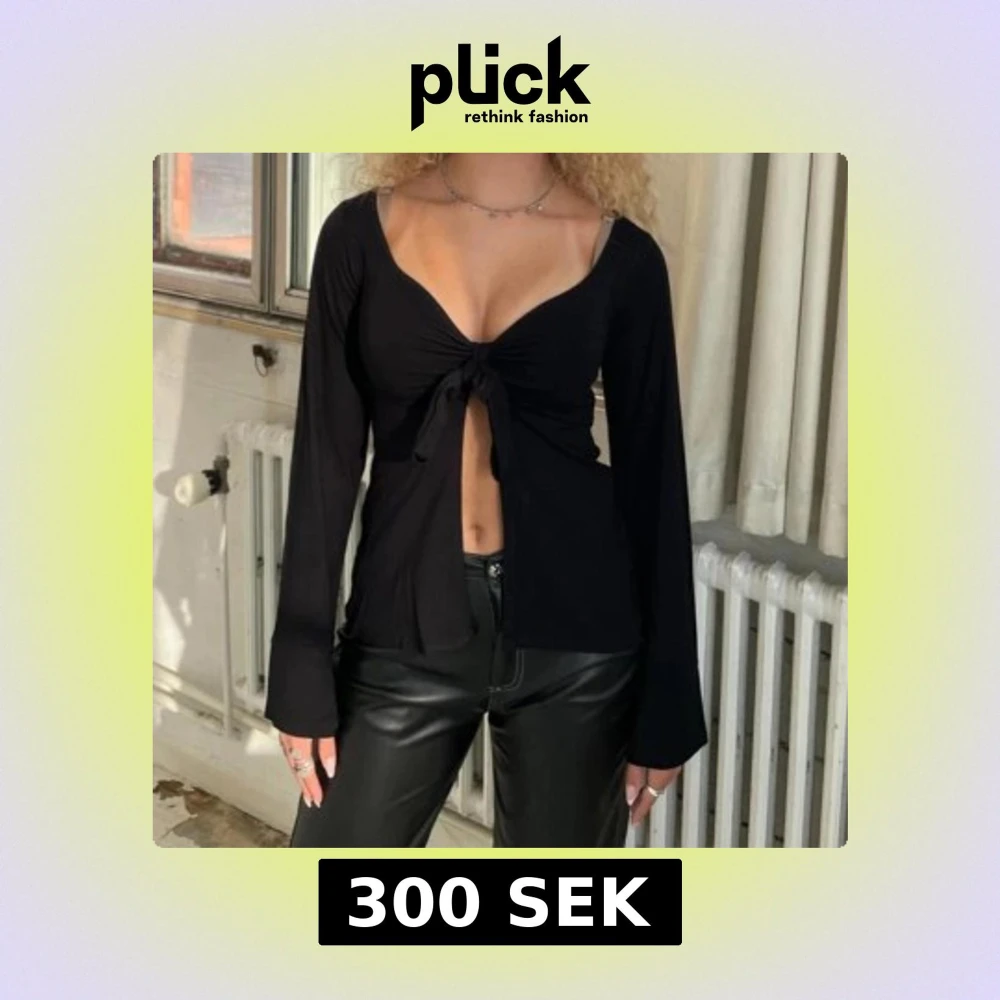 Svart långärmad blus med djup v-ringning och knyt framtill. Toppen har en croppad passform och vida ärmar, vilket ger en trendig och edgy look. Perfekt att styla med höga byxor eller kjol. Aldrig använd som ny 🤩