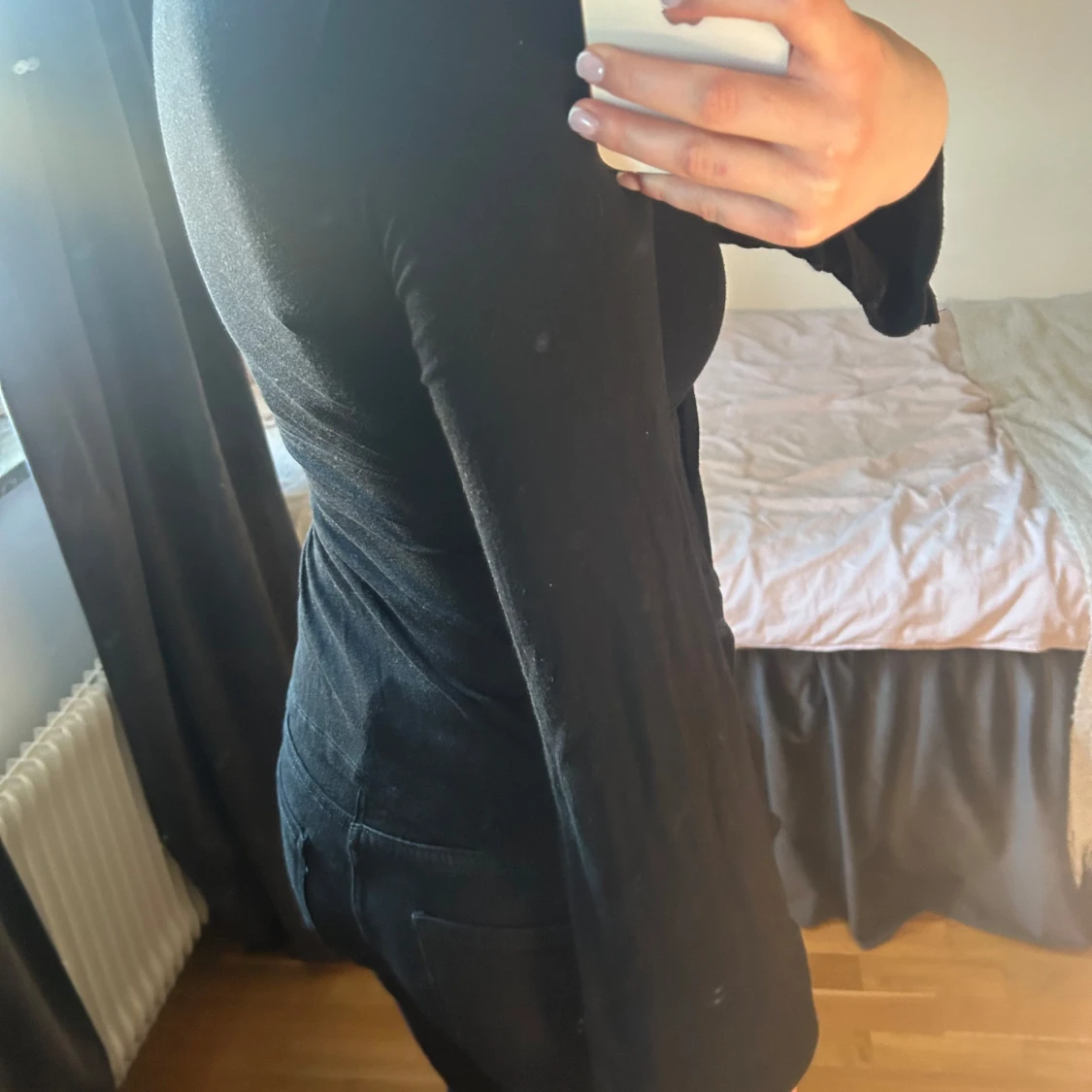 Snygg svart långärmad topp med djup v-ringning och knyt framtill från Design by Si. Storlek XS/S så passar båda. Den är lätt använd, men fortfarande i mycket bra skick, inga defekter.