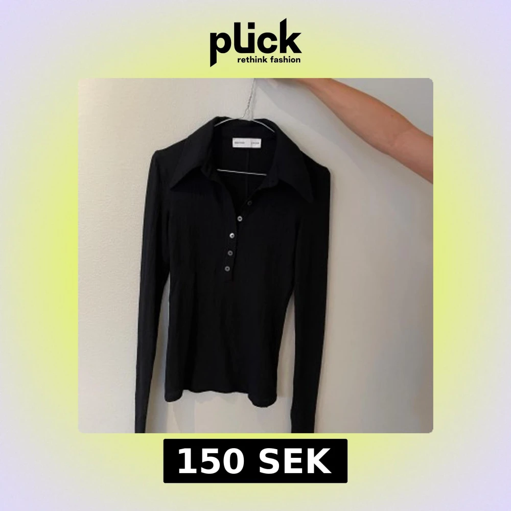 Snygg svart polotopp från H&M Studio med lång ärm och klassisk krage. Toppen har en ribbad struktur och knappar framtill som ger en cool retrovibe. Perfekt att styla med jeans eller kjol för en trendig look.