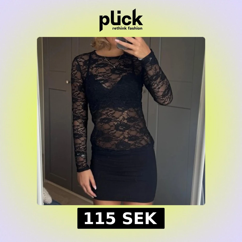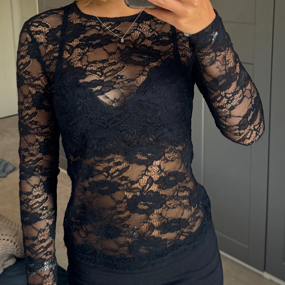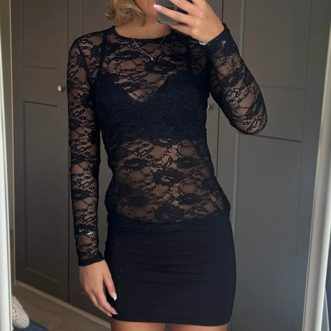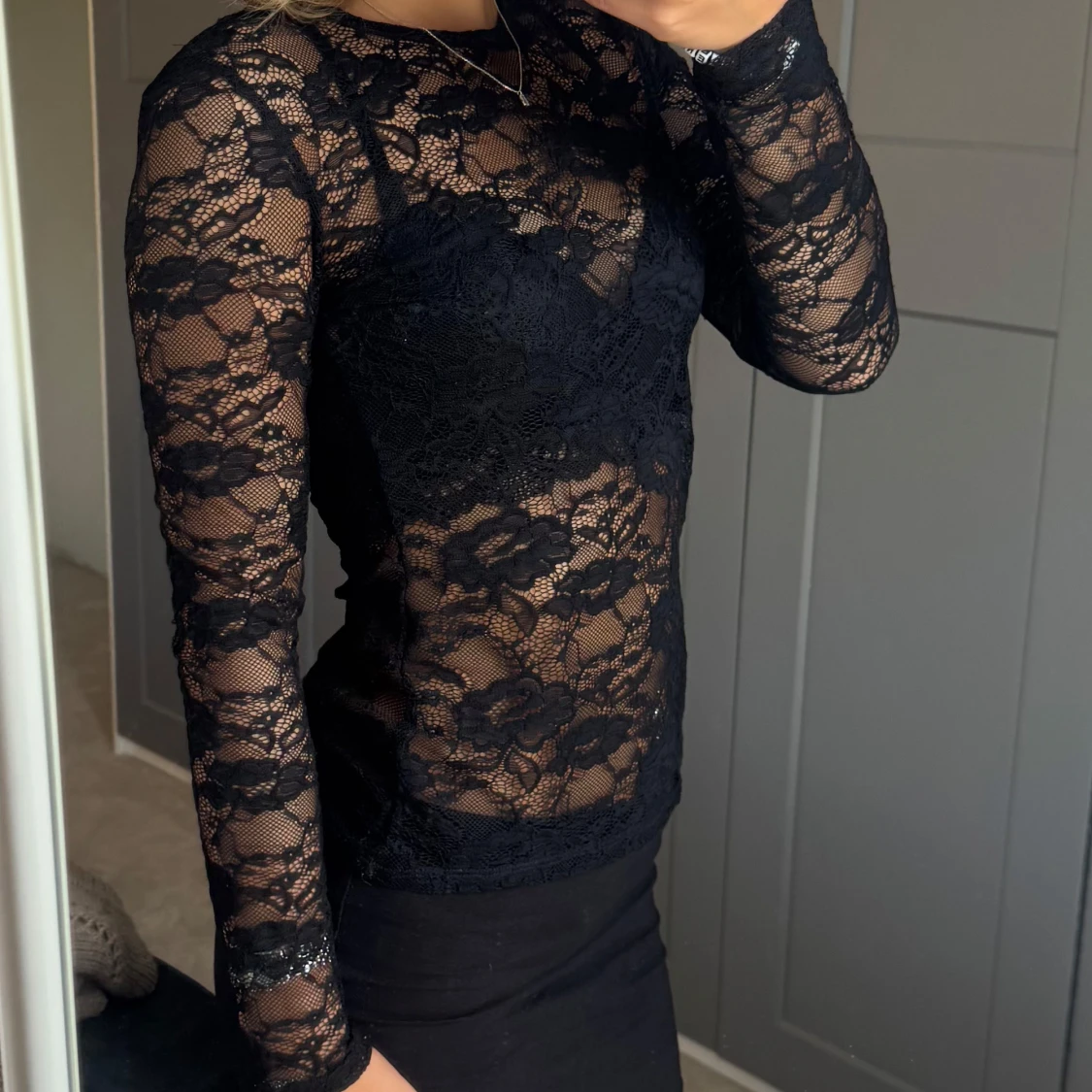 Säljer en svart långärmad blus i genomskinlig spets med blommigt mönster. Blusen har en figurnära passform och rund halsringning. Perfekt att styla med ett snyggt linne under för en cool och trendig look.