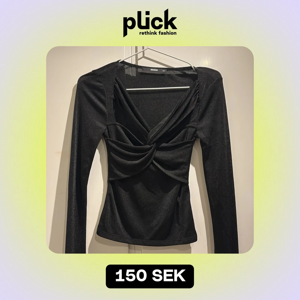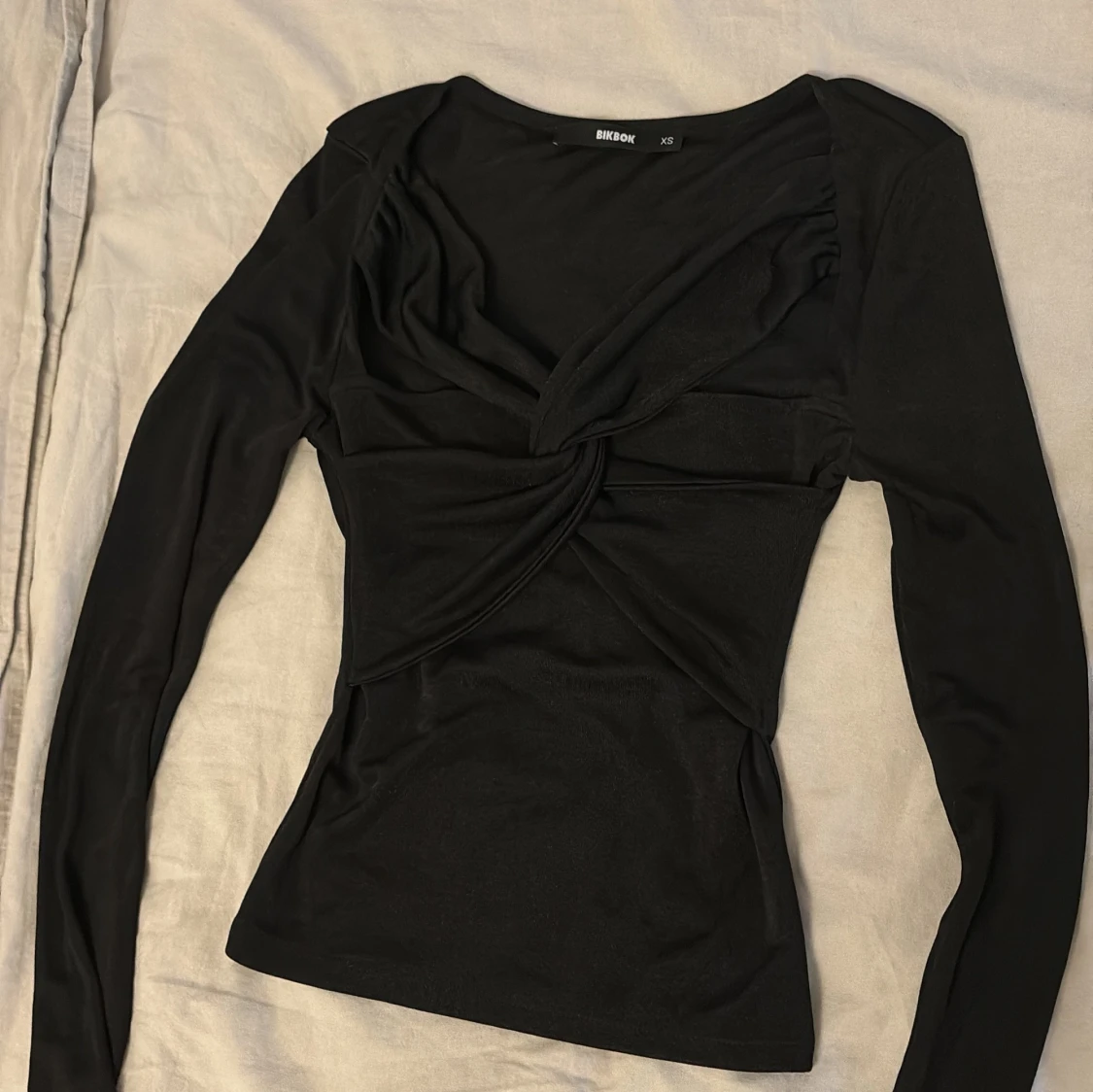 Snygg svart långärmad topp från Bik Bok i storlek XS. Toppen har en unik draperad design framtill som ger en cool twist. Perfekt för både vardag och fest! 🖤