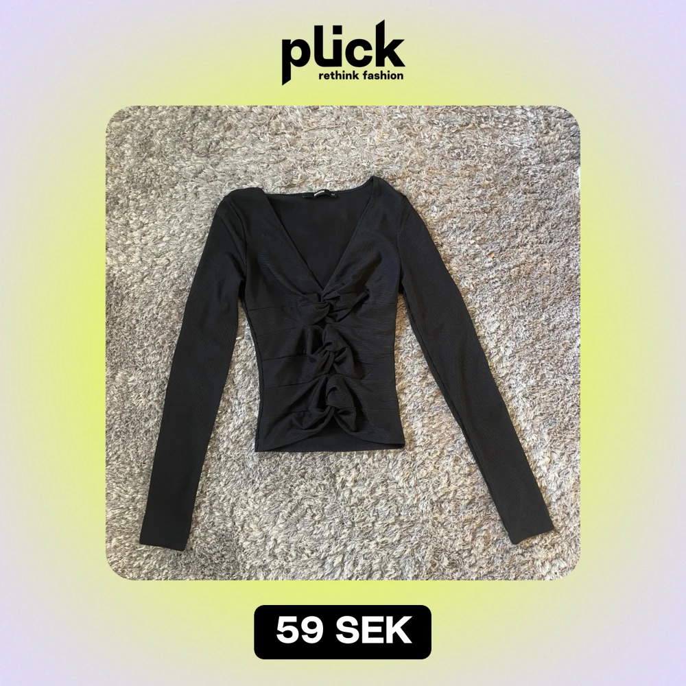 Snygg svart långärmad topp från BikBok i storlek XS. Toppen har en v-ringad design med knytning framtill som ger en elegant touch. Perfekt för både vardag och fest!