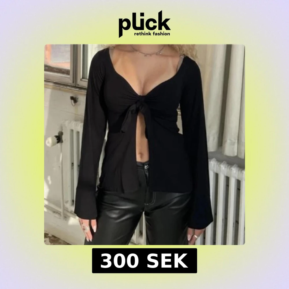 Snygg svart långärmad topp från Design by Si med knytning framtill. Perfekt för en stilren look med en touch av elegans. Toppen har en v-ringad design och är tillverkad i ett mjukt material.